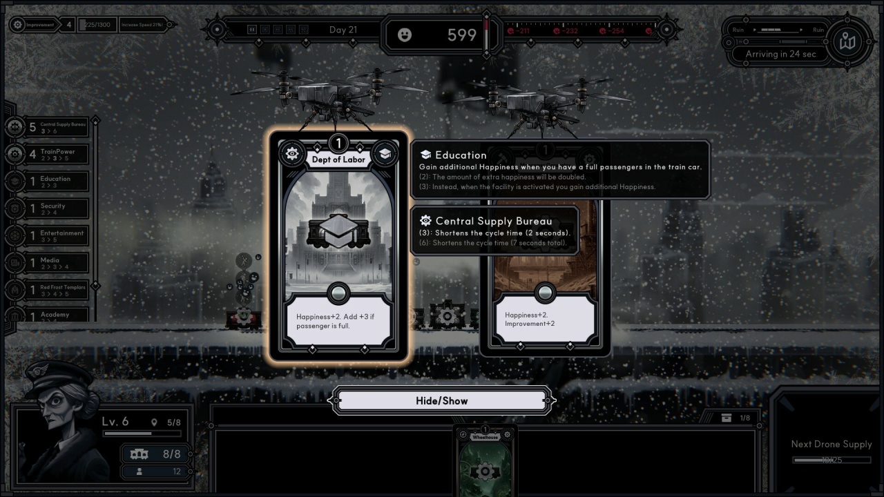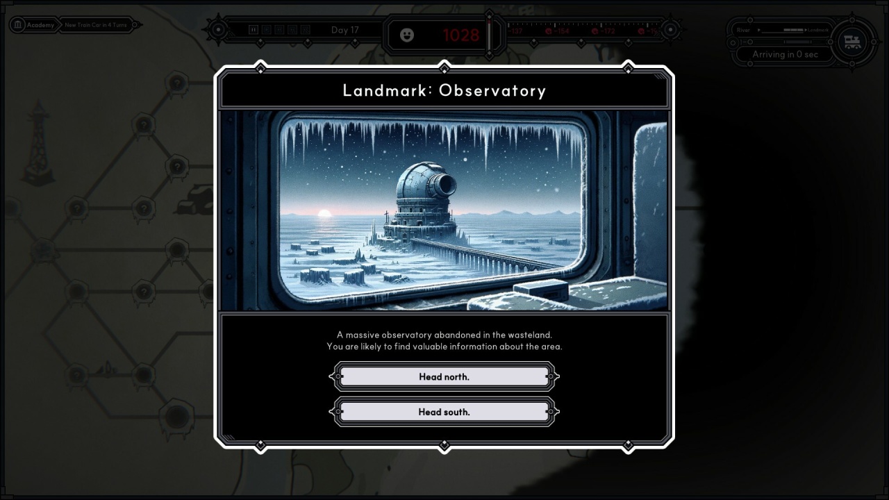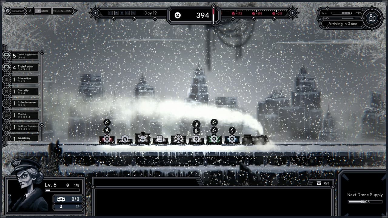 Каждое решение дает шанс улучшить характеристики поезда и создать рабочие связки между разными секциями, однако успех не предопределен. Путь к мифической Земле Обетованной полон постоянных трудностей. Пересечение опасных токсичных зон является необходимым этапом для достижения восточной цели. Кроме того, сзади надвигается неумолимый шторм, что придает экспедиции неотложный характер. В этой игре кондуктор отвечает за проведение поезда и его жителей сквозь эти риски, принимая решения, от которых зависит успех всей миссии.