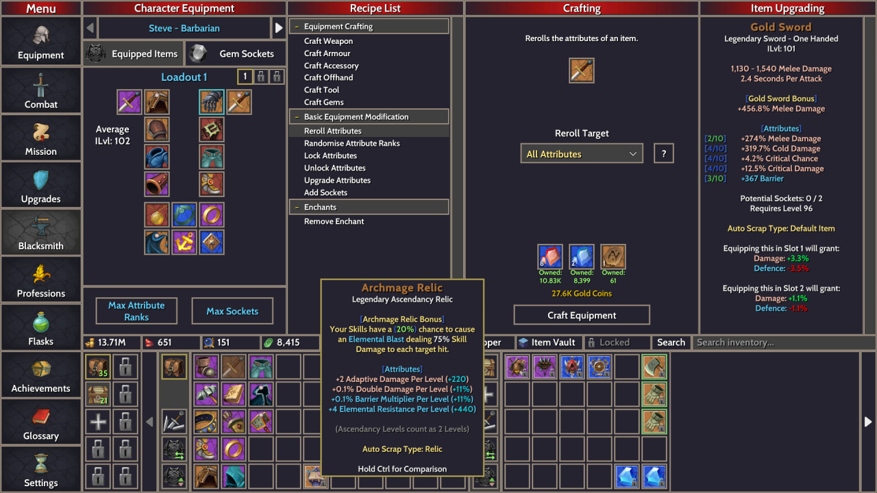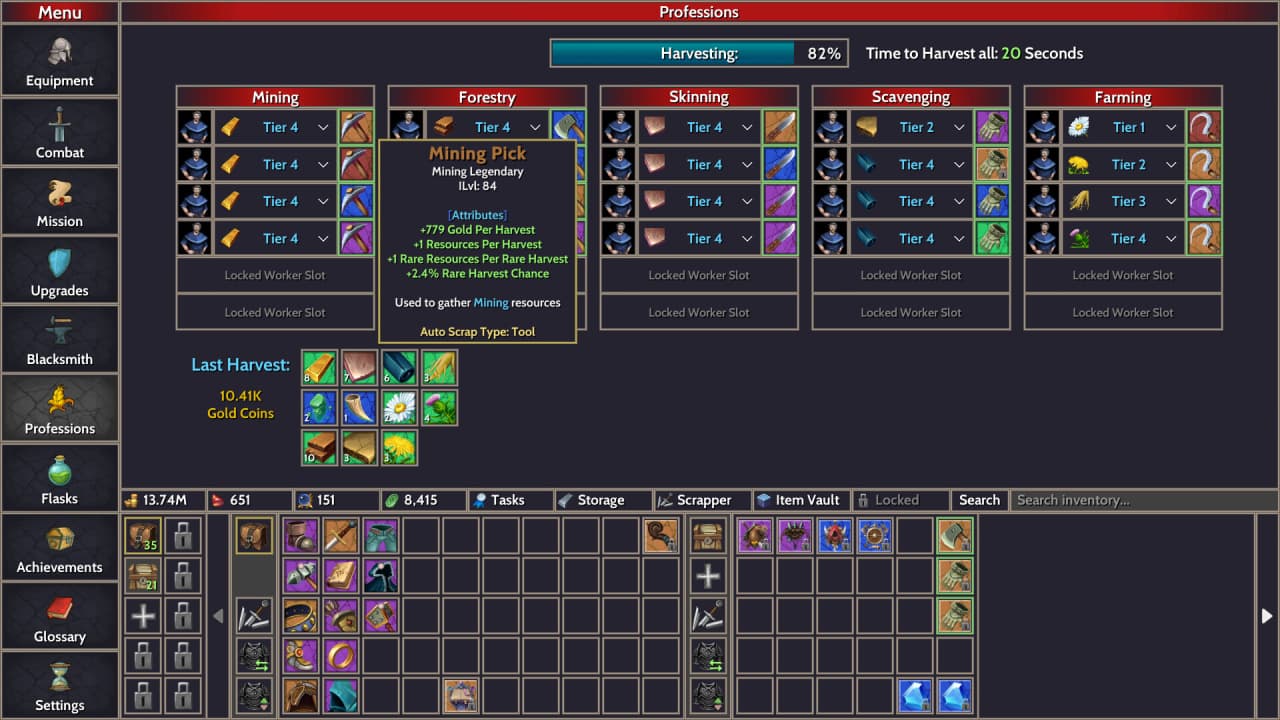 Сражения включают противостояние перечню из 100 видов монстров и 50 отдельных боссов, отличающихся своими особенностями и списками выпадающих вещей. Игроки собирают из ассортимента 500 единиц экипировки, чтобы снабдить своих бойцов, подстраивая их возможности под разные испытания. Для поддержки существуют 14 создаваемых фляг, которые можно улучшать для повышения боевой эффективности в зависимости от ситуации, что дополнено 50 мощными финальными чарами, предназначенными для вывода сборок на новый уровень.