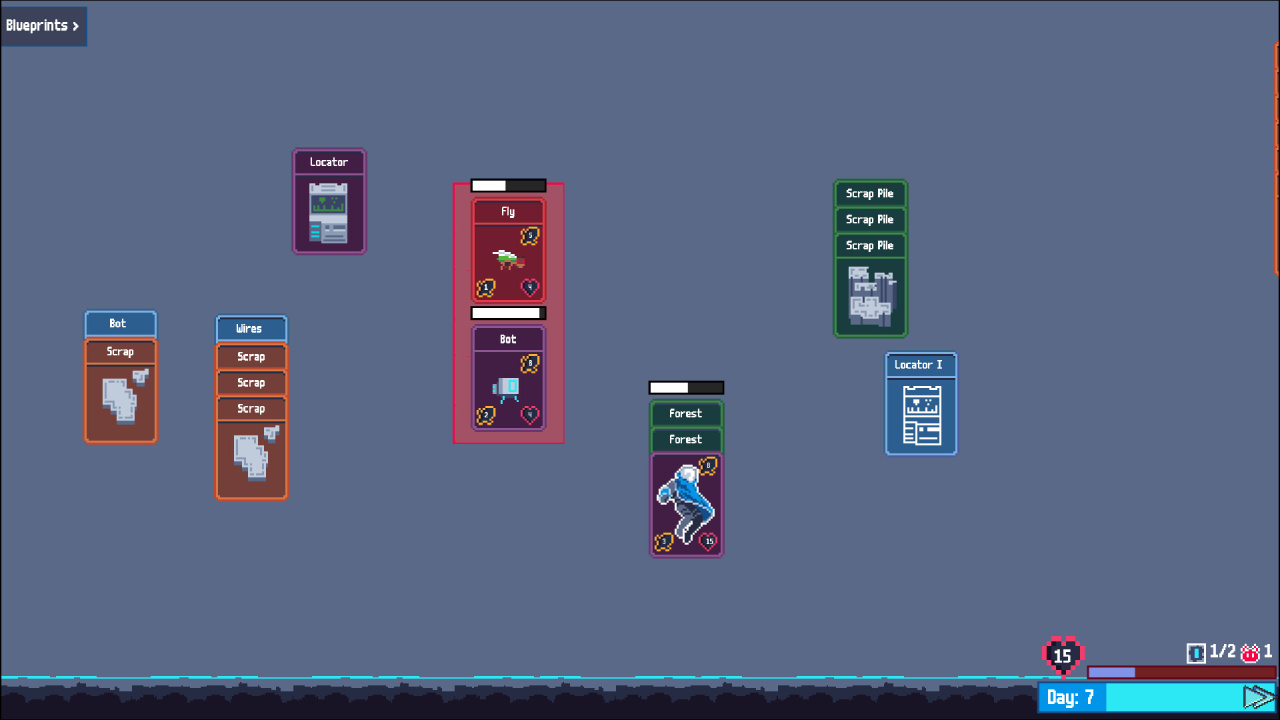 Боевые столкновения инициируются автоматически, когда карта игрока или союзного бота помещается прямо на изображение неприятеля. Враги разнообразны: от существ типа жуков до агрессивных индивидуумов, встречающихся при изучении локаций или во время особых ивентов. Можно повлиять на исход таких автоматических сражений, направив несколько союзных ботов на одну вражескую цель одновременно. Такое размещение сил помогает одолеть более крепких оппонентов за счет численного превосходства.