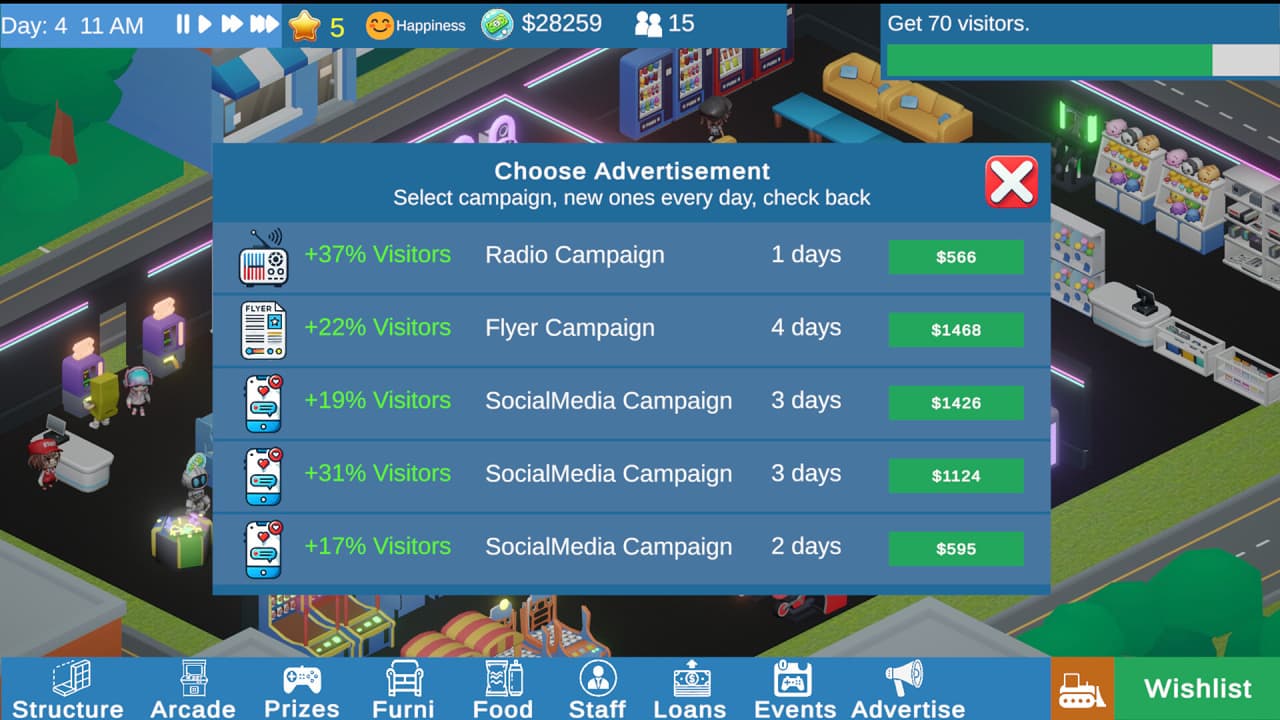 Задачи по управлению распространяются на организацию мероприятий, таких как состязания на лучший счет или танцевальные турниры на территории комплекса. Необходимо нанимать персонал, каждый сотрудник обладает характеристиками, влияющими на скорость ремонта или уборки, а также на его зарплату. Геймеры используют создаваемые рекламные акции, выбирая варианты, которые предположительно привлекут больше посетителей согласно представленным данным. Все эти системы вместе формируют модель управления финансами и повседневными делами аркады.