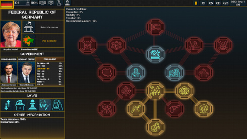 Геймплей строится вокруг нескольких ключевых механик, определяющих развитие страны. Участники выбирают национальные курсы, описывающие политические и финансовые стратегии для достижения целей в Европе. Определенные решения, такие как запуск правительственной пропаганды или изменение денежной массы, становятся доступны по ходу прохождения. Управление хозяйством включает возведение новых объектов и корректировку бюджетных ассигнований для таких областей, как инфраструктурные проекты, научные исследования, содержание армии и административный аппарат, а также установление средней зарплаты.