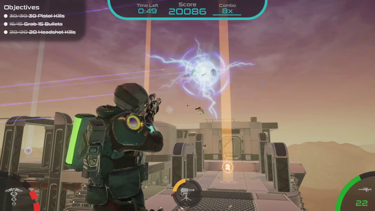Ключевая механика CHRONOSHOT заключается в том, что течение времени зависит от активности геймера, давая паузы для оценки обстановки и планирования тактики. Контроль над временем затрагивает и взаимодействие с окружением: можно ловить вражеские снаряды прямо в полете, превращая их в пополнение боезапаса. Эта система позволяет анализировать развитие боя в реальном времени. Данный шутер мотивирует повышать свою эффективность, что напрямую связано с возможностью заработать больше очков.