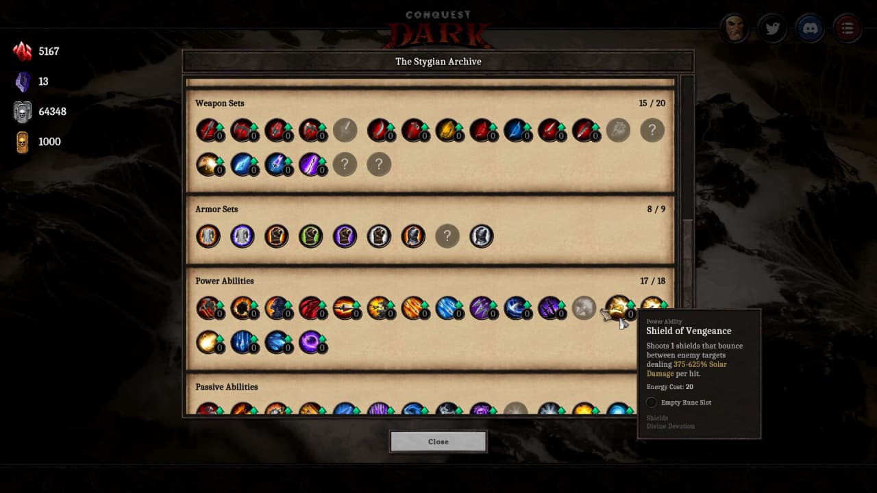 Структура этого тайтла совмещает механики экшен-рогалика и bullet hell, требуя от геймера постоянного перемещения и мгновенной реакции. Геймплей в Conquest Dark основан на сессиях, именуемых забегами Темного Ритуала, имитирующих ускоренное наращивание силы персонажа, сравнимое с долгим развитием в иных ARPG. Игроки стартуют каждый забег с ограниченным набором возможностей, получая доступ к способностям и экипировке в процессе прохождения.