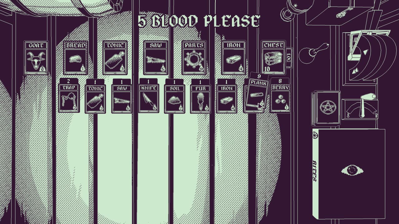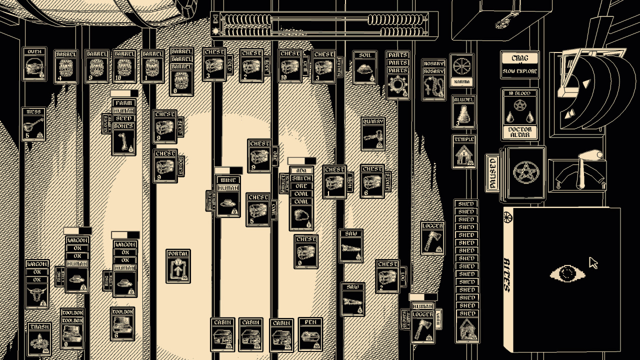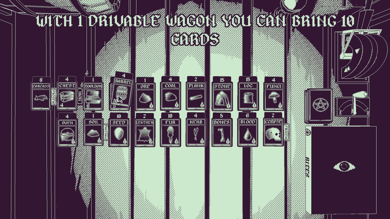 Продвижение по сюжету включает перемещение по нескольким картам, отражающим масштаб тропы, с фортами для отдыха, торговли и починки, а также с трудностями вроде речных переправ. Календарь отслеживает время, влияя на потребности отряда, такие как потребление пищи на основной карте. Персонажи могут экипировать определенные карты, представляющие предметы для получения бонусов, в то время как оккультное древо технологий позволяет глубже погрузиться в мрачные элементы этой карточной игры, потенциально расширяя доступное пространство через порталы в иные измерения.