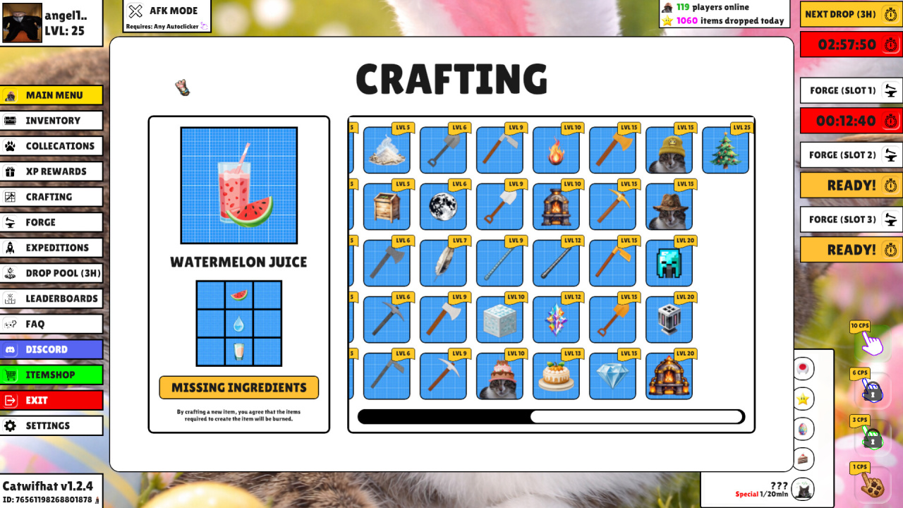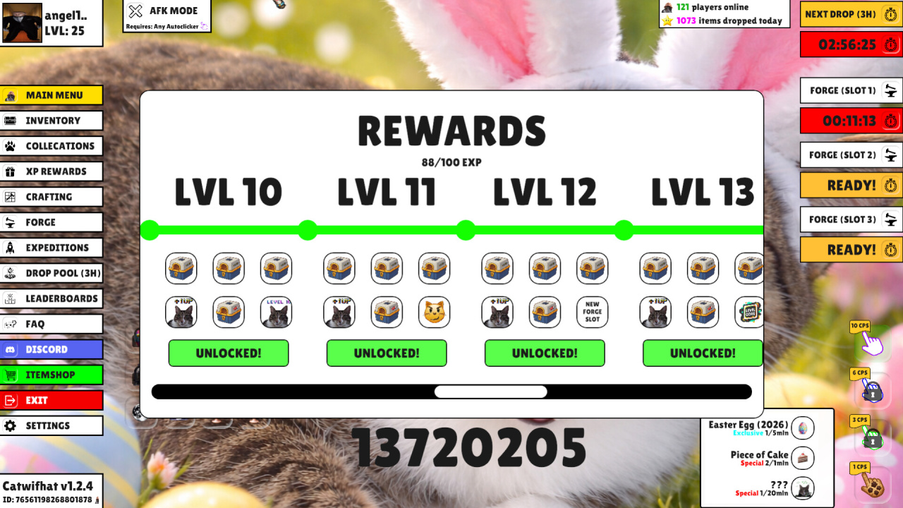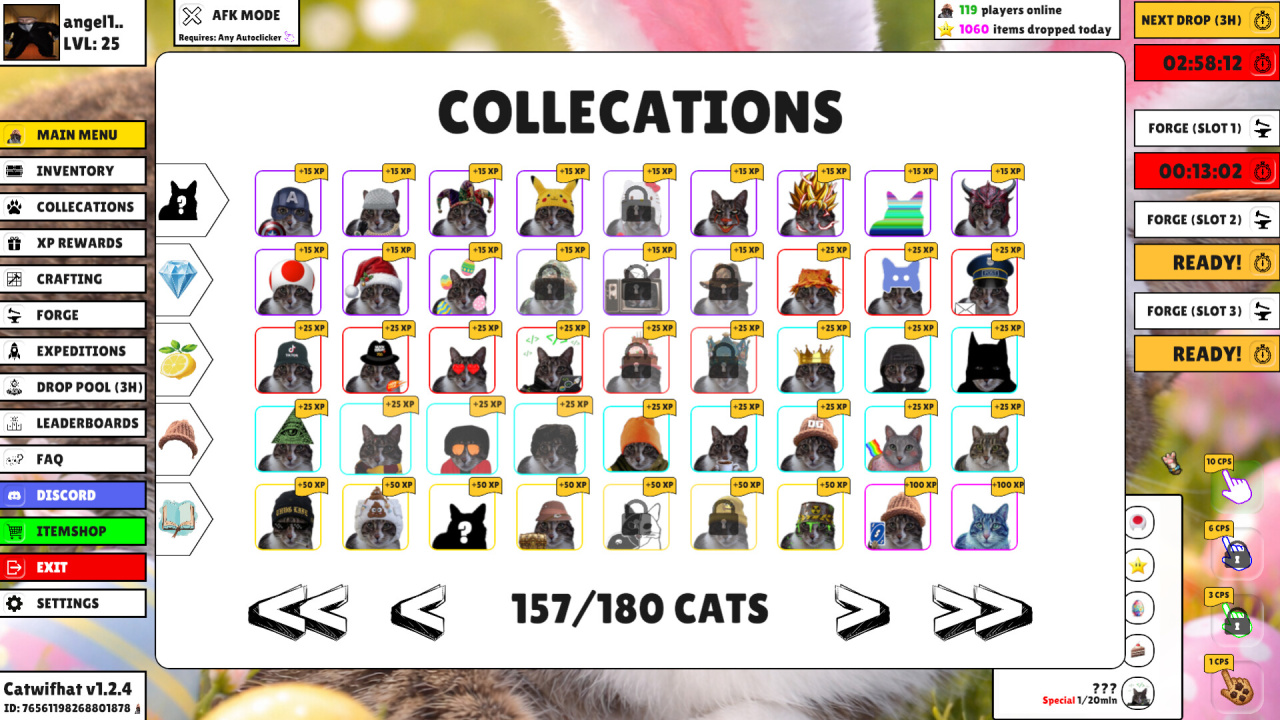 Система развития в Catwifhat включает получение новых изображений котов, каждое с потенциально разным внешним видом. Постоянные клики напрямую помогают этому накоплению, давая возможность постепенно расширять свою коллекцию. Кроме того, тайтл содержит механику выдачи по времени: каждые 3 часа игрок автоматически получает особый вариант кота. Такой способ получения дополняет активные нажатия, предоставляя еще один путь для обретения новых образов со временем.