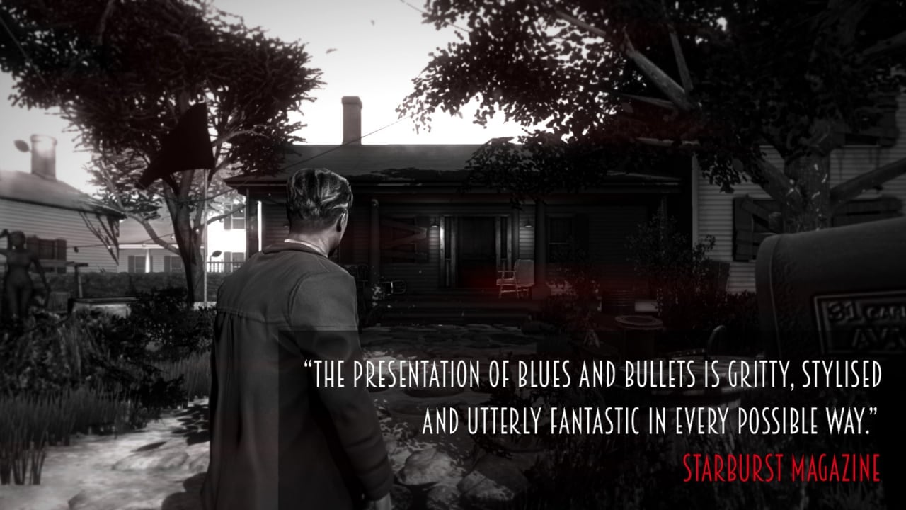 Blues and Bullets – квест-адвенчура с огромным количеством заставок на движке игры, раскрывающие сюжет более детально. Всё повествование разделено на главы для лучшего восприятия происходящего. Каждая сцена интерактивного кино имеет места, где игроку предложено выбирать реплику, сказанную главным героем, что создаёт небольшие отличия. Достоинством станет удобно реализованное управление с помощью как мыши и клавиатуры, так и геймпада. Игра использует необычную стилистику – мрачный город, выполненный в темных тонах, с использованием лишь белого и чёрного цвета, с редким вкраплением красного и других оттенков, подчёркивающего важные детали.