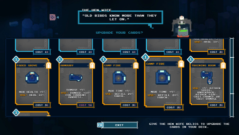 Продвижение также включает завоевание благосклонности Девы Урожая и поиск Реликвий для обмена с такими сущностями, как Старуха-курица и Вулвер, фигурами из шотландского фольклора, что служит для улучшения своего набора. Создание подземелья в этой игре разворачивается по мере развития событий, с использованием набора карт для размещения комнат, проходов и других элементов. Колода геймера меняется через взаимодействие с персонажами, встреченными внутри руин, или путем получения одобрения Дамы. Размещение комнат, например, костров и библиотек, в непосредственной близости от других может активировать эффекты, требуя предусмотрительности для каждой вылазки.