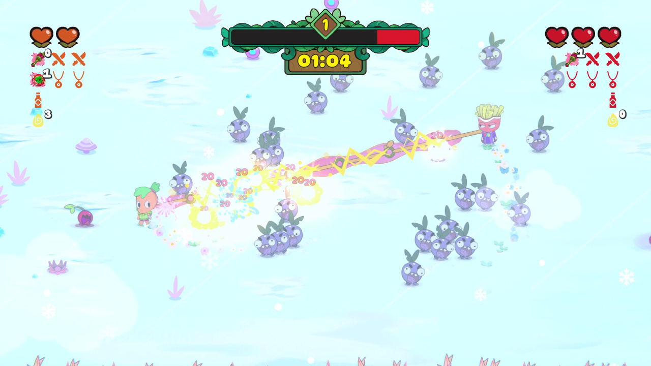 В Vinebound: Tangled Together лоза не только соединяет юзеров, но и помогает выстраивать стратегию. Оружие и управление временем перезарядки передаются по лозе, создавая уникальную систему "пинг-понга". Каждое оружие требует отдельного подхода, что позволяет адаптировать действия в зависимости от улучшений и предпочтений геймера. Например, Банановый Меч позволяет наносить удары в одном направлении, а клубничный посох — использовать мощную магию, что добавляет разнообразия в бои.