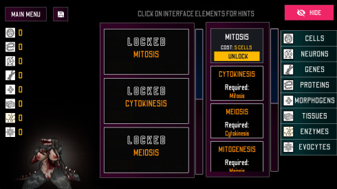 Дополнительные ресурсы определяют дальнейший путь развития создания. Морфогены применяют нейроны для выработки еще большего числа клеток, увеличивая биологическую массу. Ткани действуют как автоматические кликеры, поддерживая генерацию без прямого вмешательства со временем. Ферменты служат для противостояния враждебным Ксеноцитам, повышая урон, наносимый этим противникам в рамках механик тайтла.