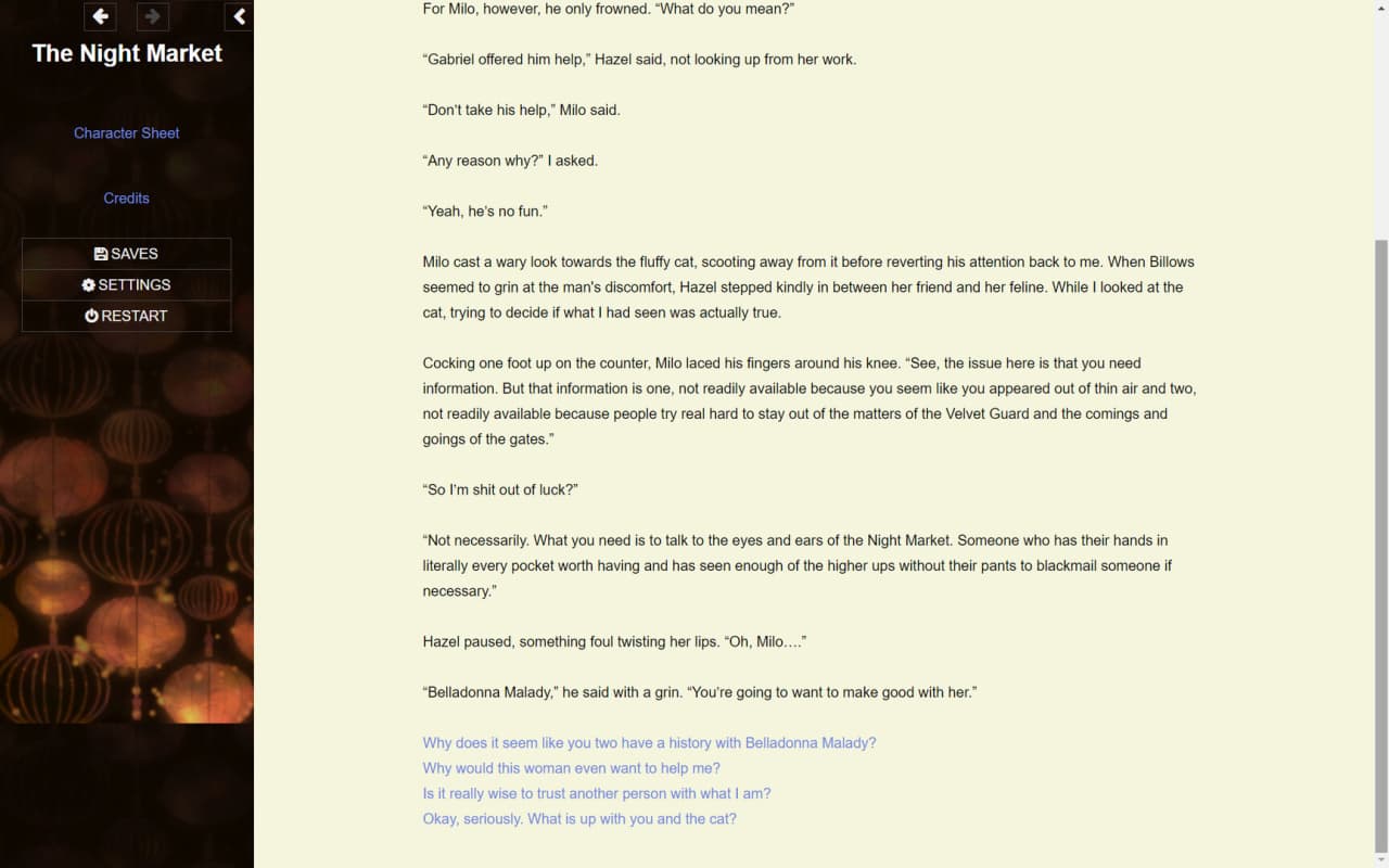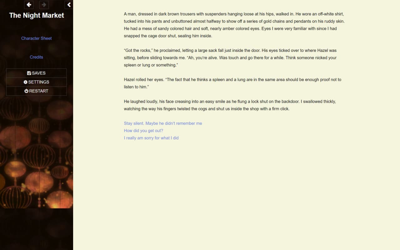 The Night Market Дата выхода 31 авг. 2023 Разработчик Zinnia Demitasse Жанр RPG Очень положительные на основе 57 обзоров в Steam 84% Торрент ожидается Добавьте в избранное, чтобы следить The Night Market помещает юзера в окружение, наполненное фонарями, после пробуждения, не помнящего о своем прибытии. Главная задача - найти определенные ворота, чтобы вернуться в исходную точку. Этот процесс осложняется местными политическими ситуациями, установленными правилами и скрытой информацией, казалось бы, призванной отвлечь внимание. Юзеры перемещаются по сеттингу от первого лица, совершая действия и участвуя в разговорах, которые определяют их путь. При создании персонажа в The Night Market можно выбрать мужскую, женскую или небинарную идентификацию, а также изменить внешность и личные атрибуты, что, в сущности, позволяет игрокам наложить свой собственный отпечаток на происходящее. Однопользовательская игра сочетает в себе элементы интерактивной фантастики, ролевых игр и приключенческих экшенов в фэнтезийном сеттинге с магией и вампирами. Геймплей делает акцент на исследовании узла Ночного рынка и раскрытии его секретов. Взаимодействие с другими персонажами является основным компонентом; развитие сюжета в значительной степени связано с межличностными отношениями, будь то платонические или романтические, что ставит симулятор знакомств на первое место. Принимаемые решения, часто через диалоговые деревья, влекут за собой последствия, которые могут изменить траекторию развития тайтла и открыть доступ к ранее недоступным областям, а значит, выбор действительно имеет значение. Игра включает в себя возможности для ЛГБТК+ романтики. Скачать торрент Скриншоты Видео из игры Скачать БЕЗ торрента прямая ссылка через uTorria Системные требования ОС: Windows 7, 8, 10 (64 бита) Приключенческий экшен, Кастомизация персонажа, От первого лица, Романтика, Решения с последствиями, Повествовательная, Глубокий сюжет, Фэнтези, Магия, Вампиры, Атмосферная, Драма