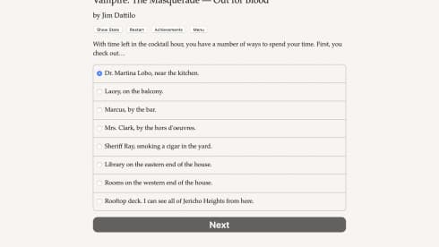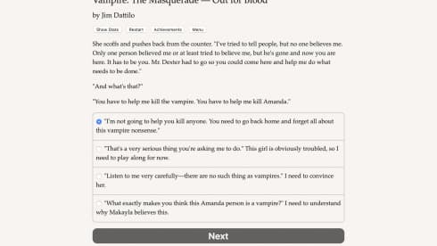 Vampire: The Masquerade - Out for Blood v Build 15551782 Новая версия Полная версия Последняя в альт. раздачах Дата выхода 29 июл. 2021 Разработчик Choice of Games Жанр RPG, Инди, Приключения В основном положительные на основе 173 обзоров в Steam 74% Обновлено 5 апреля 2025, 18:36 Список изменений Vampire: The Masquerade - Out for Blood ставит игрока на место новичка, который обустраивается в Джерико-Хайтс, пригороде Чикаго. Попытки освоиться включают знакомства и возможное налаживание контактов. Размеренное течение жизни прерывается известием, что городок населяют вампиры. Ситуация накаляется, когда соседи начинают исчезать, что вынуждает протагониста вмешаться в происходящее. Сюжетная основа Vampire: The Masquerade - Out for Blood строится вокруг противостояния местным кровопийцам, в особенности Честейну — созданию возрастом свыше 100 лет. Геймеру предстоит выступить в качестве охотника на вампиров с целью положить конец его влиянию. Отдельная группировка молодых тонкокровных вампиров вносит сумятицу, развязав войну против Честейна. Эта игра ставит перед выбором: примкнуть к одной из сторон, объявить охоту на всех кровососов, посвятить себя изучению их природы или пожелать самому стать одним из них. Поиск соратников становится ключом к разрешению проблем города, поскольку выборы геймера напрямую влияют на развитие истории. При создании аватара можно определить его пол (мужской, женский или небинарный) и ориентацию (гей, гетеро или би). Протагонист развивается путем распределения очков по различным атрибутам и умениям, важным для выживания и проведения расследований. Предстоит общаться со множеством других людей и вампиров, что открывает путь к альянсам или любовным связям как с людьми, так и с ночными охотниками. Весь этот текстовый игровой проект на 455 000 слов развивается согласно решениям героя, принимаемым через представленные варианты действий. Скачать торрент Скриншоты Показать больше Видео из игры Скачать Vampire: The Masquerade - Out for Blood Тип релиза Пиратка Portable (Таблетка: Вшита) Версия v Build 290721 Размер 118.6 МБ Интерфейс Английский Озвучка Отсутствует Установка: Примечание Более актуальная версия: v Build 15551782находится в блоке - Альтернативные раздачи. Скачать .torrent торрент файл Скачать БЕЗ торрента прямая ссылка через uTorria Альтернативные раздачи Прямые ссылки Облачные хранилища v Build 15551782 53 МБ Показать Системные требования ОС: Windows 7, 8, 10 (64 бита) Процессор: Celeron Оперативная память: 4 ГБ Видеокарта: Intel HD 3000 Место на диске: 118 МБ Казуальная, Вампиры, Выбери себе приключение