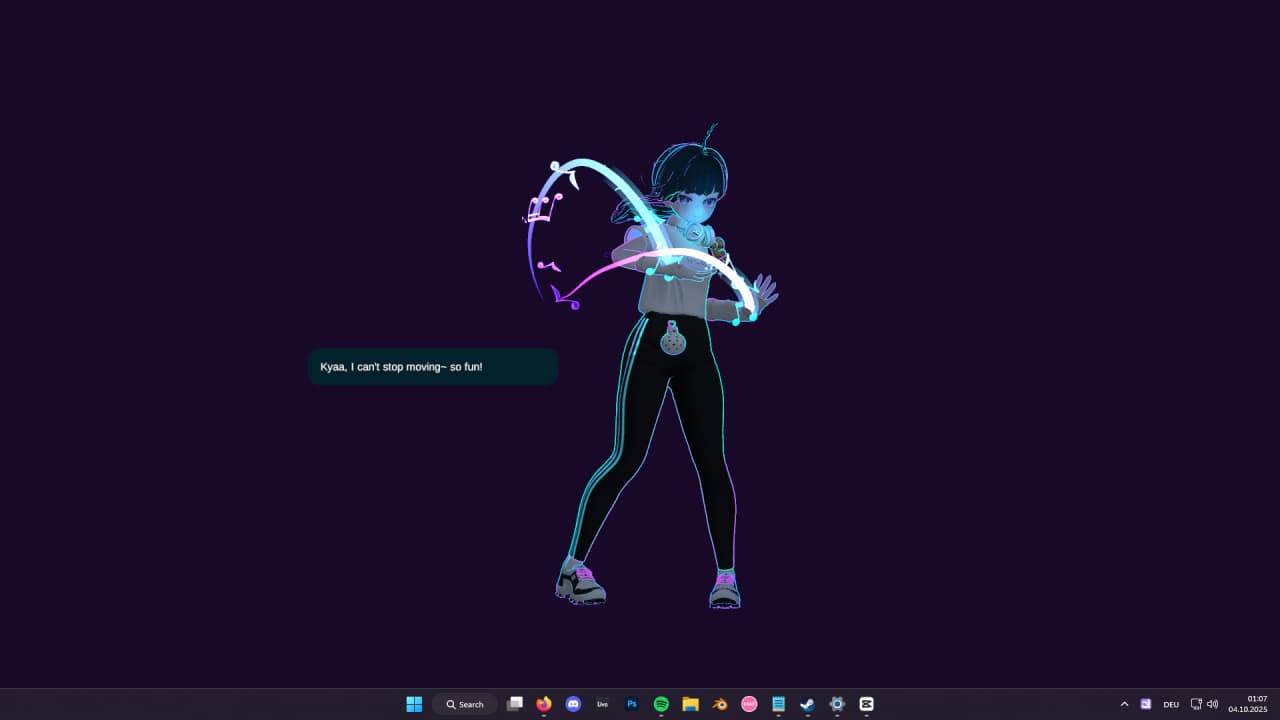 Герой обладает дополнительными возможностями и альтернативными состояниями, которые могут быть активированы в процессе игрового взаимодействия. Модель способна выполнять танцевальные номера, которые запускаются автоматически, когда аудио воспроизводится из разрешенной юзером программы. Эта игра позволяет общаться с цифровым компаньоном через функцию чата, работающую на локальном ИИ для обмена простыми сообщениями. Перетаскивание героя на панель задач заставляет его принять позу отдыха, а удержание курсора над его ногами превращает его в физически меньшую версию себя.