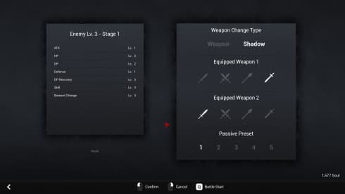 Исход этих встреч зависит от выполнения идеальных парирований, вызывающих контрудары, и применения элементальных рун для получения особых эффектов по мере того, как игрок продвигается через 16 неповторимых оппонентов. Развитие в BATTLE SHADOW ARENA происходит через несколько уровней настройки, существующих параллельно с битвами. Этот проект предлагает экипировать персонажа из более чем 60 пассивных умений, распределяя их по 5 настраиваемым пресетам для адаптации к различным боевым ситуациям.