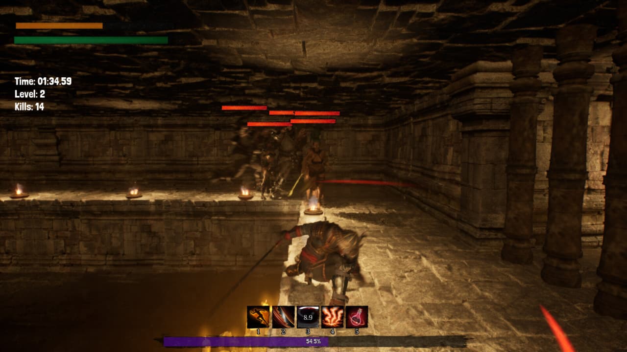 При повышении уровня протагонисту предлагается случайный выбор перков или улучшения характеристик — roguelite-механика, обеспечивающая неповторимое развитие каждой сессии. Игра предлагает 2 различных режима. В режиме Кампании цель — продержаться 5 минут до появления босса, а победа присуждается после его ликвидации. Бесконечный режим снимает временные рамки, измеряя успех общим временем выживания против нескончаемых волн недругов. Сложность со временем возрастает в обоих вариантах прохождения.