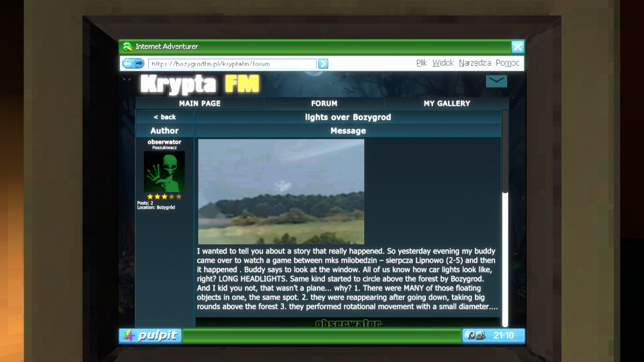 Krypta FM RUS v Build 15166829 Новая версия Полная версия Последняя Дата выхода 19 июл. 2024 Разработчик Under The Sink Studio Жанр Приключения, Инди Обновлено 28 мая 2025, 13:25 Список изменений Krypta FM переносит игроков в деревню Гоздары на территории Польши. Местное население фиксирует необъяснимые происшествия, нарушающие привычный уклад жизни. Эти зафиксированные события связывают с деятельностью некоего существа, которое называют Зверем из Гоздары и которое предположительно обитает в окрестностях. Обнаружение и исследование физических следов, оставленных этим созданием, составляет одну из ключевых задач. Разгадка тайны этой игры включает сбор и анализ информации из разнообразных источников. Помимо следов, важную роль играют радиопередачи, звучащие внутри Krypta FM. Прослушивание эфиров становится методом получения данных, необходимых для продвижения в расследовании. Ценные фрагменты сведений скрываются среди шумов и голосов в радиоэфире, требуя от геймера внимательности. Обстановка проекта передает атмосферу польской деревни начала 2000 годов с узнаваемыми деталями быта того времени. Геймплей также интегрирует стилистику и структуру веб-форумов эпохи раннего интернета, влияя на представление некоторой информации. Игровой мир предлагает погружение в специфическую временную и культурную среду. Навигация по локациям деревни и прилегающих территорий, а также обработка полученной информации ведут к пониманию сути происходящего. Каждое найденное доказательство и услышанное сообщение приближают к разрешению загадки, стоящей перед юзером. Скачать торрент Скриншоты Показать больше Видео из игры Русификатор: Примечание Русификатор к игре (текст) можно найти выше под спойлером. Скачать БЕЗ торрента прямая ссылка через uTorria Альтернативные раздачи Прямые ссылки Облачные хранилища v Build 15166829 150 МБ Показать Системные требования ОС: 10 / 11 (x64-bit) Процессор: Dual Core 2.4 GHz Оперативная память: 6 ГБ Видеокарта: 1 ГБ Место на диске: 300 МБ Симулятор ходьбы, Атмосферная, Хорроры, Исследования, Глубокий сюжет, Проработанная вселенная, Детектив, Тайна, Открытый мир, Стилизация, Повествовательная, От первого лица, Ретро, Психологический хоррор