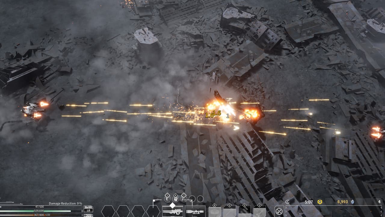 Gigantes Ex Machina представляет конфликт через призму шутера с видом сверху и элементами roguelite. Игрок управляет мехом по имени Гигас, которому предстоит выдерживать постоянные атаки многочисленных противников в условиях затяжных сражений. Ключевая механика включает тактическое использование IRCM для отражения бесконечного шквала снарядов, включая пули и управляемые ракеты.