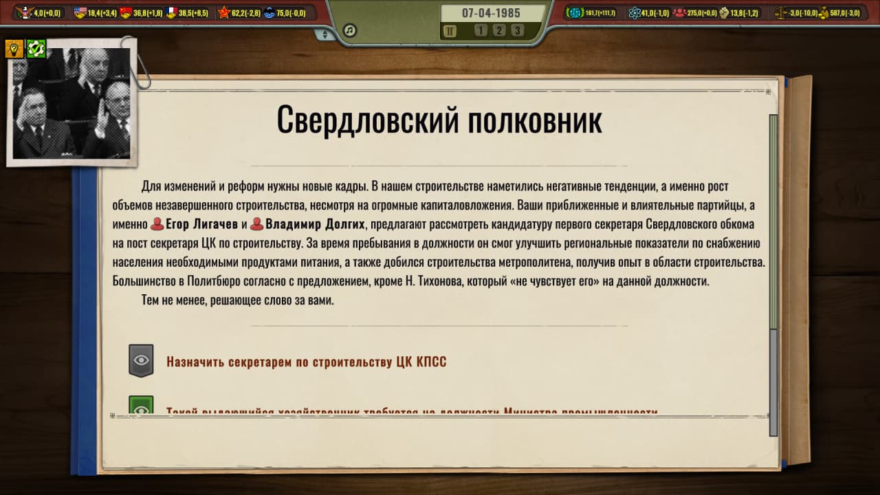 Действия игрока распространяются на государственный бюджет и научные разработки, где можно выделять средства на такие проекты, как советский интернет, или продолжать космическую гонку к Луне и Марсу. Дипломатическая линия определяется вашими решениями, создавая вражду или сотрудничество с Западом, Китаем и прочими державами. Данная стратегия позволяет вмешиваться в международные события, меняя установленные исторические траектории. Также можно возрождать бывшие республики, поддерживать освободительные движения или создавать на карте совершенно новые страны.