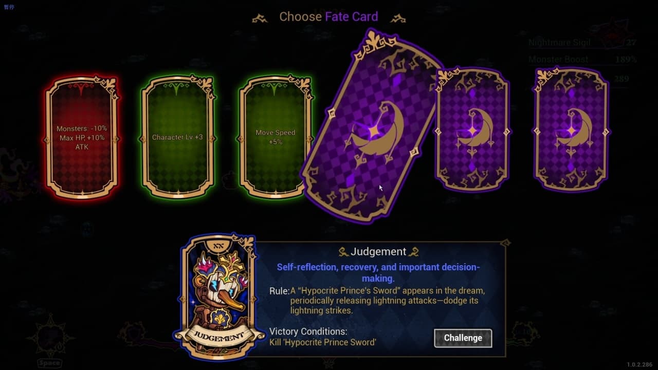 Яйца Сновидений служат основным ресурсом для настройки персонажа, влияя на игровой процесс; их можно активировать для одного комплекта бонусов или поглотить для другого внутреннего усиления, что обеспечивает тактическую гибкость. Эти умения сочетаются со способностями Таро для получения дополнительных преимуществ. Кампания этого проекта структурирована вокруг 22 этапов Снов Таро, каждый из которых предлагает особые механики и типы врагов, что требует стратегического подхода. За успешное прохождение испытания дается осколок таинственной силы соответствующей карты.