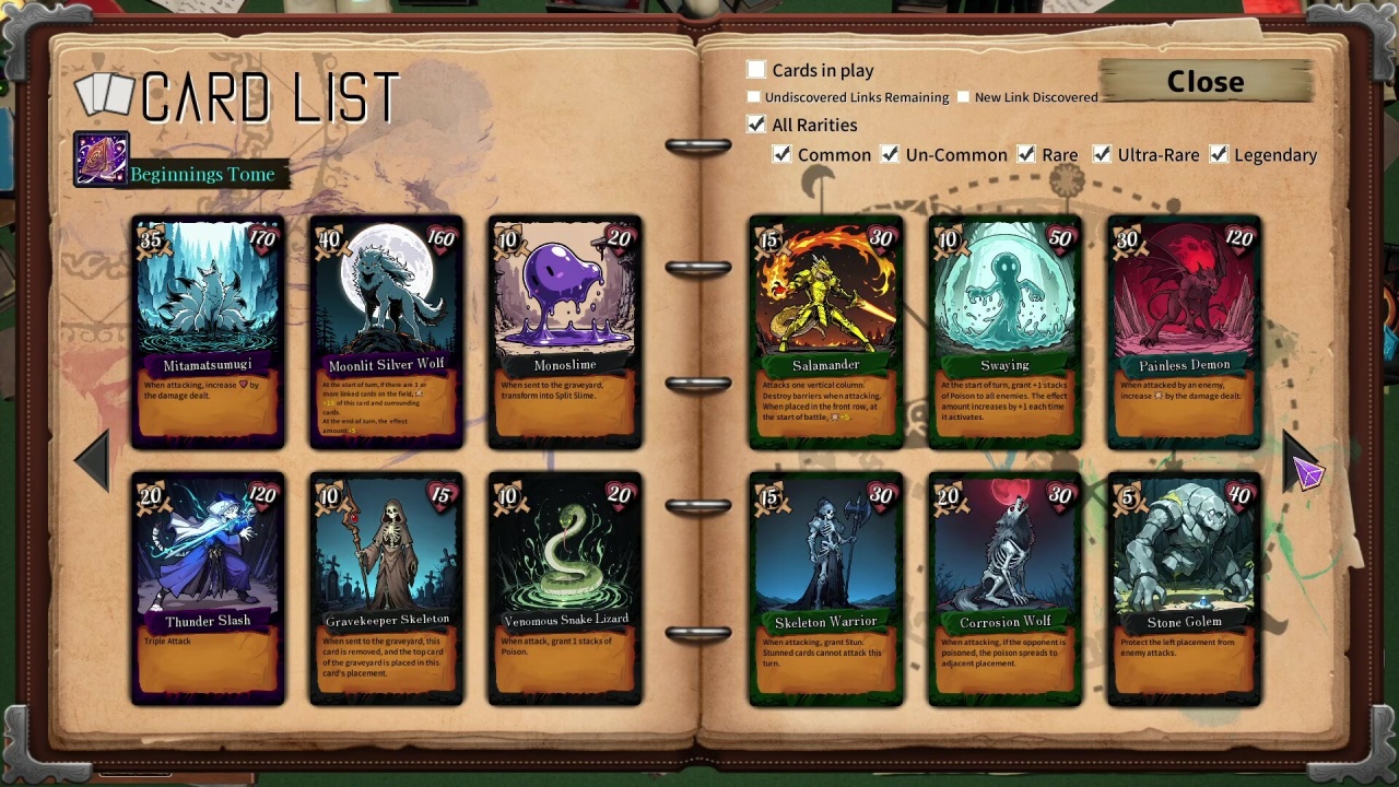Геймеры оперируют тремя разными томами, каждый из которых открывает доступ к уникальному набору для создания билда. Этот проект содержит свыше 120 основных и 100 связующих карточек, которые активируются при определенных условиях. Юзеры сталкиваются с противниками, генерируемыми случайным образом для каждого столкновения, что требует корректировки формации между сражениями. Цель игры — добиться 10 побед, собрав эффективное построение и продвигаясь от одной битвы к следующей.