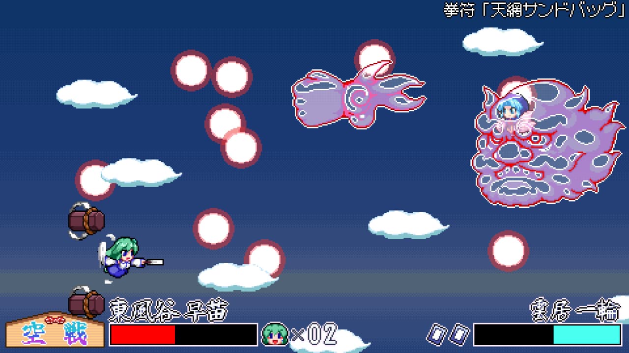Игра также включает альтернативные режимы. Один из разделов — это состязание TENGU RUMEI RACE, гонка на время по горной тропе против персонажа МАРИСЫ. В определенные моменты противники вызывают Санаэ на воздушный бой, что переключает игровой процесс на сражение в формате шутера. Во время этих битв она может свободно перемещаться в любом направлении, вести огонь очередями из снарядов ОФУДА и наносить сокрушительный удар, используя силу КАНАКО. Вся история этого проекта дополнена полностью озвученными диалогами персонажей.