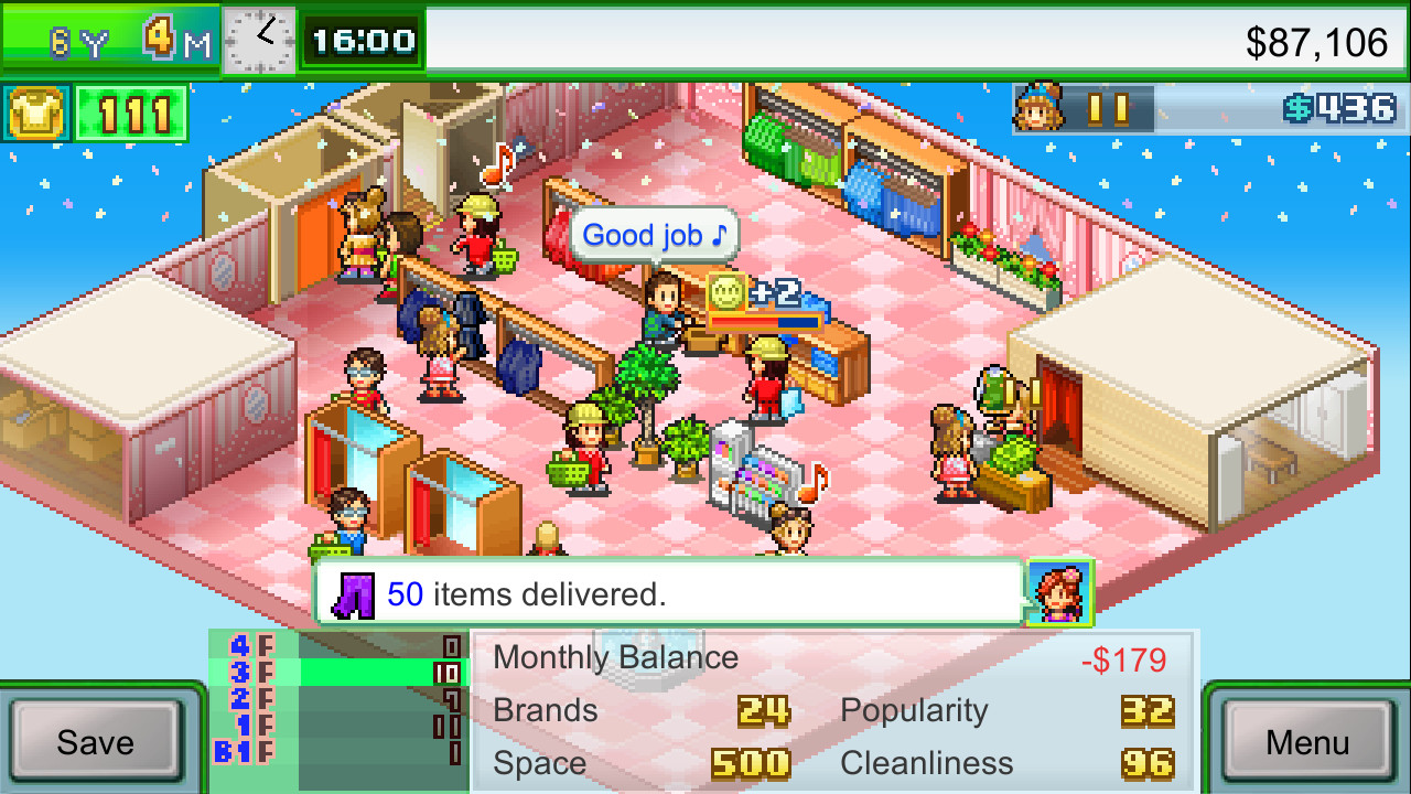 В этом проекте предстоит строить полки для размещения товаров, а сотрудники занимаются выкладкой продукции. Навыки персонала определяют, сколько посетителей привлекут витрины. Дополнительно, установка оборудования вроде примерочных комнат увеличивает число потенциальных клиентов. Ассортимент необходимо пополнять, делая заказы у производителей, при этом постоянные закупки со временем выстраивают деловые отношения с поставщиками. Полная распродажа определенной вещи дает эффект усиления для бутика.