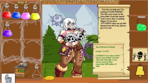 Когда снадобий недостаточно, проклятые артефакты вроде Бимбономикона или Каблуков Заимствованной Высоты предлагают альтернативные решения для борьбы с незваными гостями. Этот тайтл полностью построен на элементах кинк-тематики и их применении в рамках загадок. Значительное внимание уделяется увеличению груди как основной механике отвлечения или создания препятствий. Другие физические модификации занимают центральное место в проекте, включая расширение ягодиц, бедер и живота. Эта игра предлагает и дальнейшие трансформации, включающие изменение формы губ, лактацию, бимбофикацию и шортстекификацию, где каждая служит потенциальным исходом для героев, входящих в подземелье.