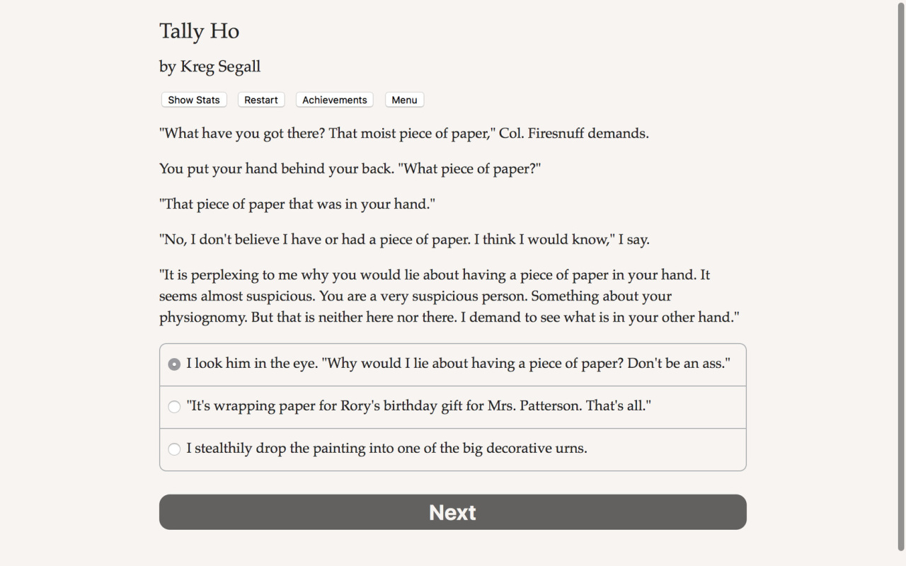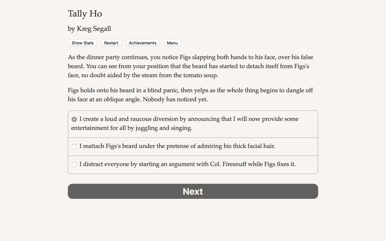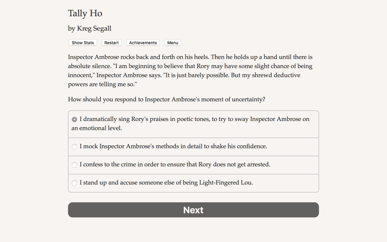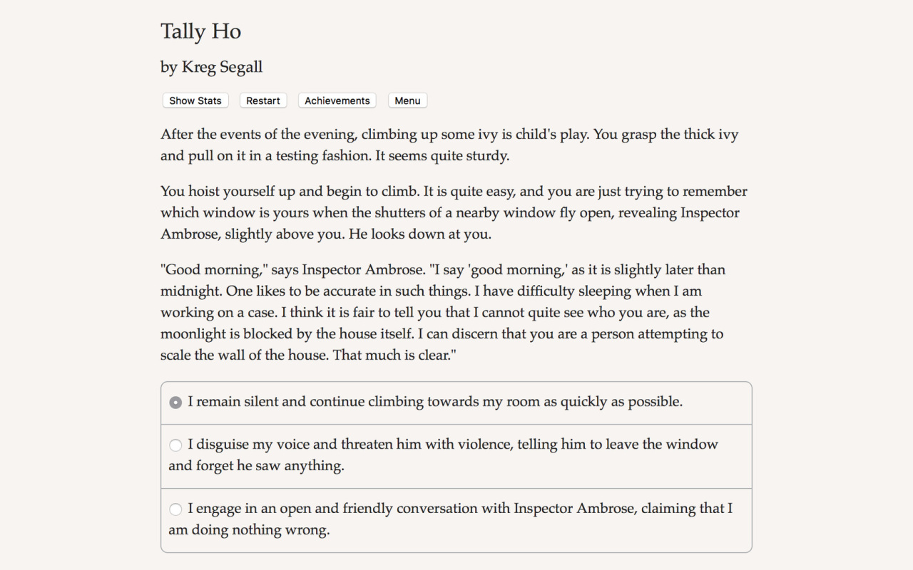 Tally Ho ставит игрока в роль личного слуги в Англии 1920-х годов. Будучи преданным камердинером или горничной персоны по имени Рори Уинтерминт, вам предстоит отправиться на выходные в загородное поместье Риторнелло. Хозяйка имения, тетя Рори по имени Примроуз, устраивает прием, создающий для вашего нанимателя сеть общественных хитросплетений, включая общение с гостями и управление охотой на лис. Ваши обязанности простираются от улаживания бытовых вопросов до вмешательства в амурные дела Рори в рамках интерактивного текста на 600000 слов, где выборы определяют развитие сюжета.