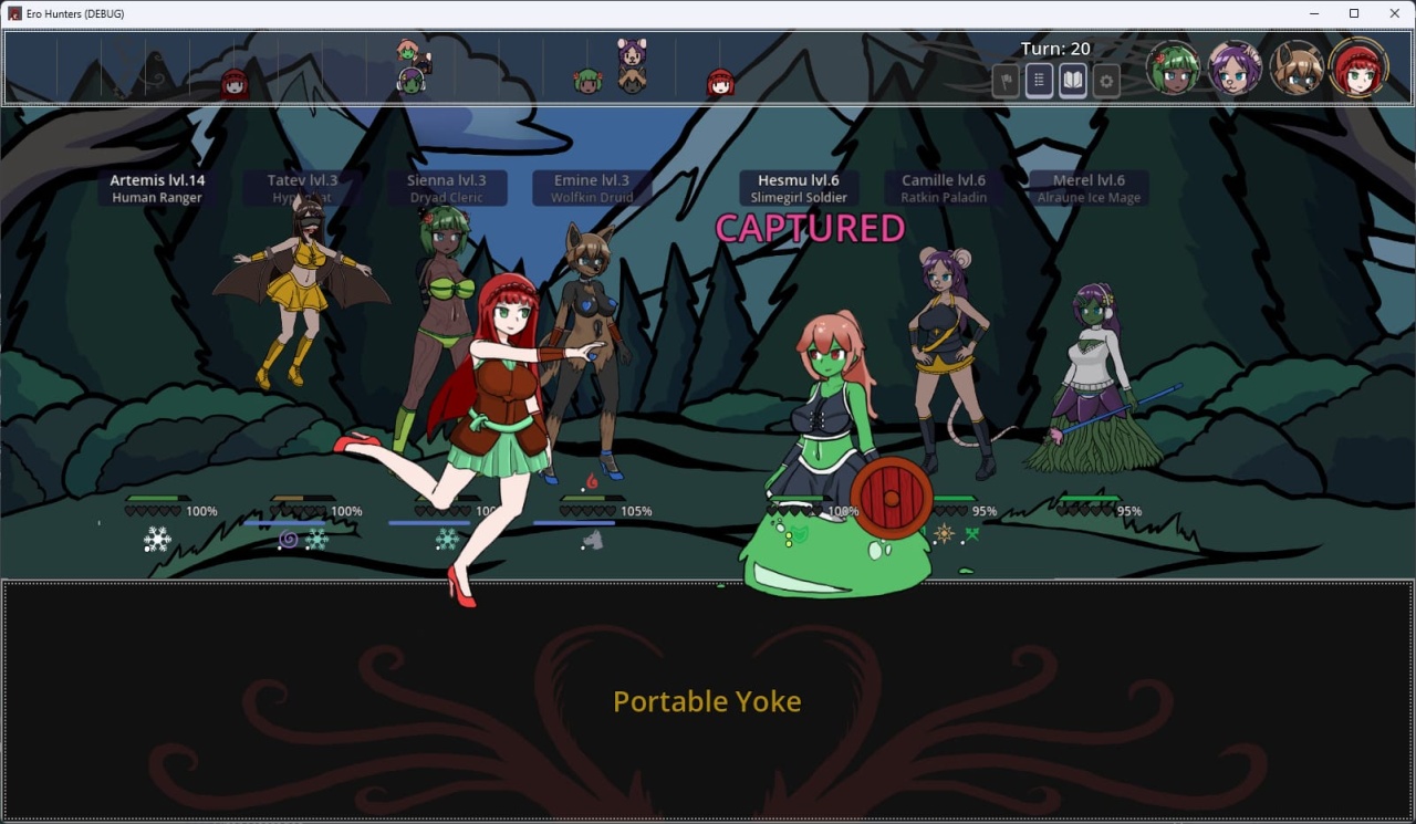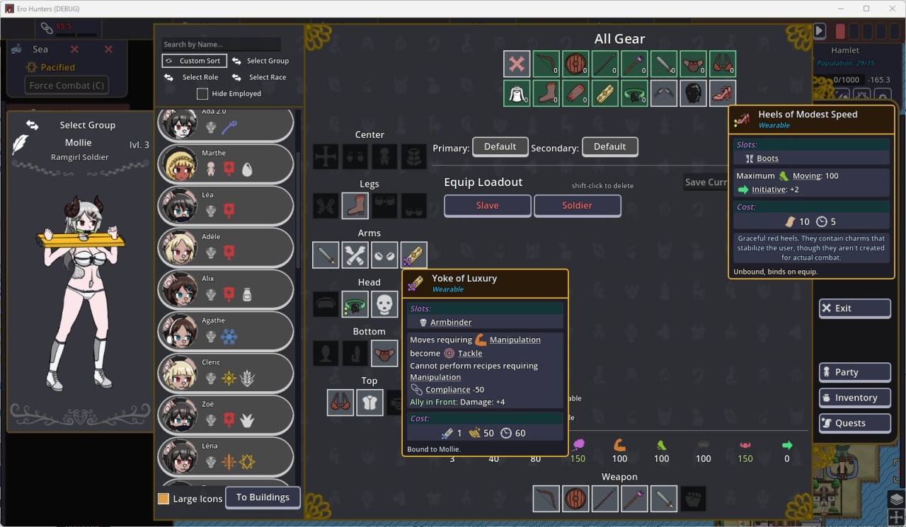 После успешной схватки геймер может пленить девушек-монстров, а не просто одолеть их. Плененные особи интегрируются в состав колонии, поначалу сопротивляясь назначенным работам. Ero Hunters предлагает систему создаваемой экипировки и особых процедур подготовки для изменения их нрава. Эти инструменты используются для подавления первоначального сопротивления и насаждения покорности. Такое управление является ключевым элементом для формирования трудовых и оборонительных ресурсов поселения.