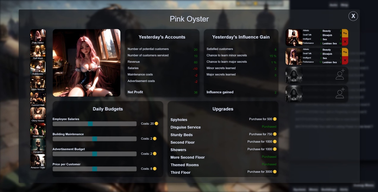 Кроме того, необходимо развивать и расширять общественную репутацию этих заведений. Центральный игровой цикл включает поиск и вербовку женщин для работы, что составляет основу механики менеджмента. Сюжет ставит главную задачу: завоевание трона и построение отношений с леди Изабель. Этот конкретный исход не гарантирован, а его достижение определяется прошлыми действиями. Выборы, сделанные на протяжении всего проекта, напрямую формируют итоговые события истории. Благодаря такой структуре игра предлагает несколько различных финалов. Каждая концовка является прямым результатом выбранного пути и принятых решений.