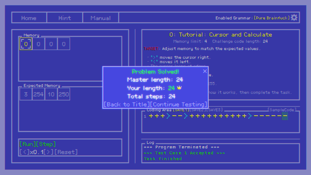 Геймеры задействуют автоматизацию и механики набора текста для продвижения по обучающей структуре. Структура Brainfuck Challenge предлагает интерактивное руководство, знакомящее с фундаментальными принципами языка. Далее эта игра ставит ряд задач с возрастающими логическими требованиями. Каждый сценарий нацелен на проверку способностей к решению проблем с применением ограниченного набора команд.