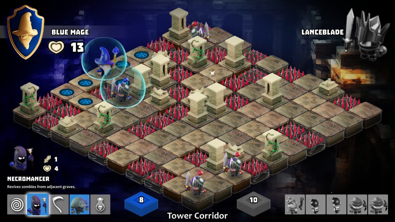 Игровой процесс включает несколько тактических систем. Сдвигая линию, можно зажать отряды противника у края поля и разместить под ними опасный ландшафт. Погибшее существо оставляет после себя могилу, блокирующую свою линию на месте, а Некромант способен использовать эти точки для воскрешения мертвых. Подобные механики позволяют запускать цепные реакции, например, уничтожив врага и воскресив павшего союзника за один ход, что меняет обстановку на доске.