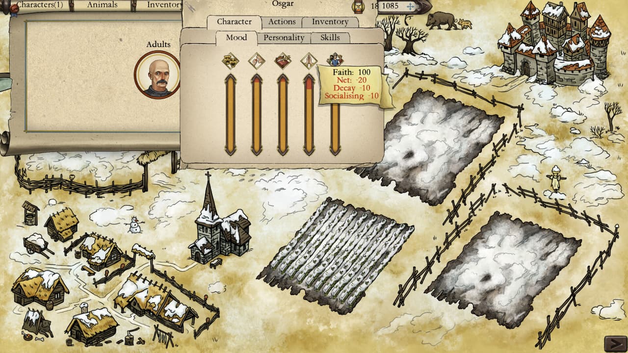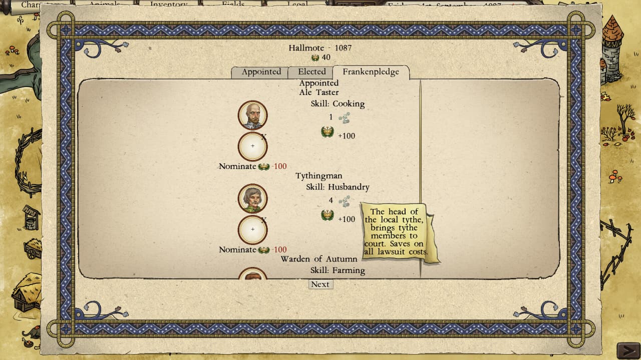 Эти семейства также борются за влияние, претендуя на местные посты или места присяжных в ходе правовых споров внутри общины и формируя сложную систему взаимоотношений. Переговоры с местным лордом о феодальных повинностях формируют ключевую механику этого проекта. Серфы обязаны отрабатывать барщину или уплачивать подати, однако расположение феодала способно даровать статус свободного человека и расширенные права, например на охоту.