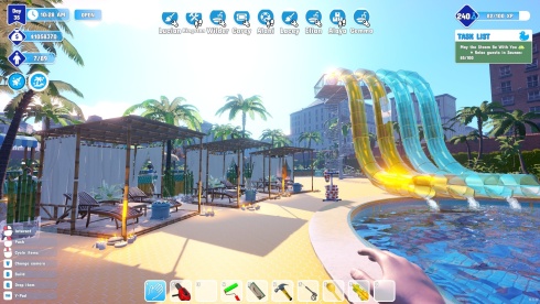 Каждый аспект планировки заведения и его оформления подчиняется прямым указаниям. Помимо основного менеджмента, Waterpark Simulator предлагает широкие возможности для персонализации. Можно перекрашивать стены, распылять оригинальные узоры на любые поверхности и менять напольные покрытия, создавая тематические зоны. Облик аквапарка дополняется расстановкой декораций и указателей.