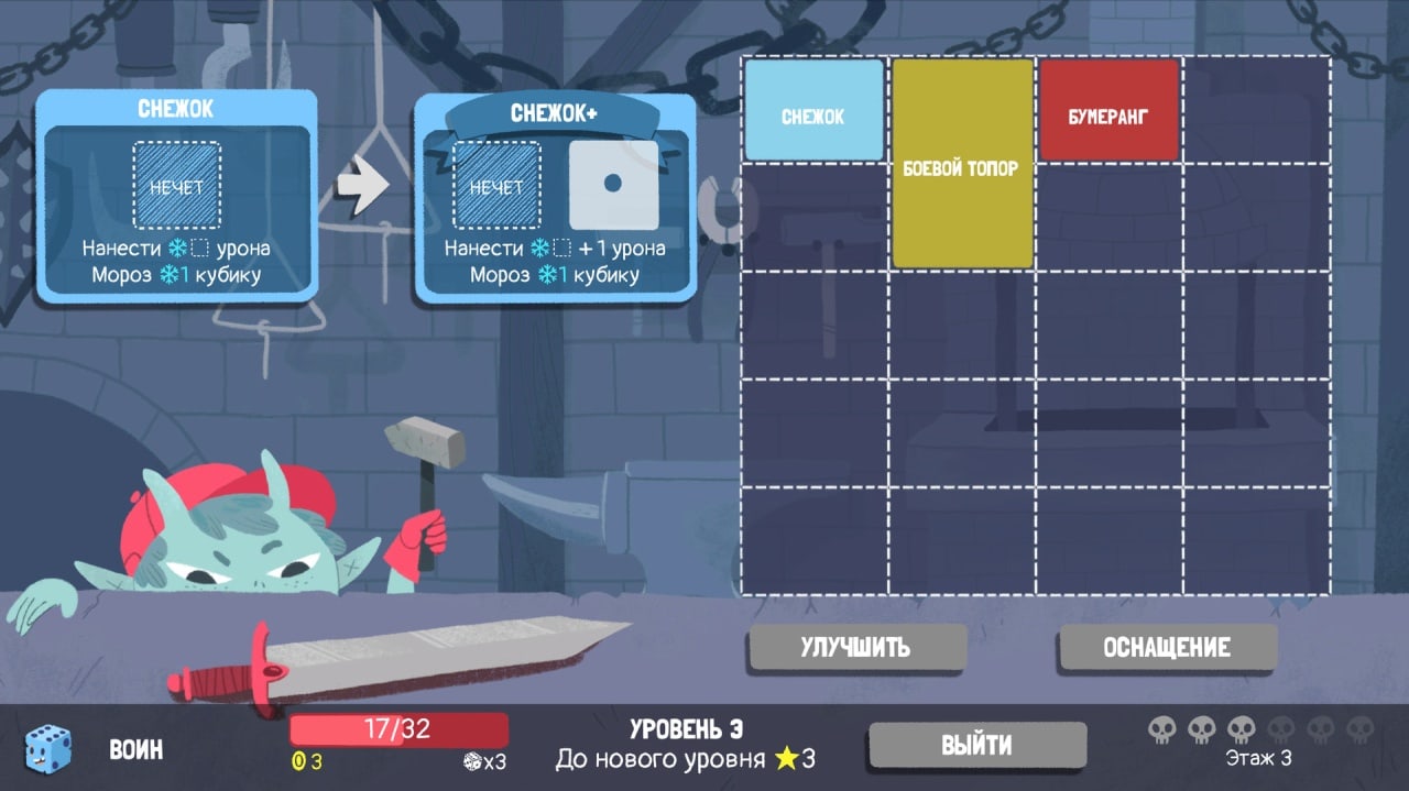 Dicey Dungeons RUS v 2.1 (58189) Новая версия Полная версия Последняя Дата выхода 13 авг. 2019 Разработчик Terry Cavanagh Жанр Инди, Стратегии, RPG Очень положительные на основе 10123 обзоров в Steam 89% Обновлено 18 марта 2025, 13:35 Список изменений Игровой процесс Dicey Dungeons сочетает элементы roguelike со сбором колоды. Главный герой оказывается на фоне шоу, где участники-авантюристы превратились в кости. Каждый из них должен пройти через опасное подземелье. Они имеют малый шанс на победу или на жизнь. Перед прохождением пользователю предстоит выбрать 1 из 6 персонажей, что определит стартовое снаряжение и предметы. После выбора подопечного, начинается приключение. Геймер способен перемещаться по обширной подземной системе. На пути повстречаются монстры, разбросанные полезные предметы, сундуки, магазины и станции для улучшения. Основная задача – добираться до выходов, ведущих на следующие уровни. В каждом забеге участнику потребуется добраться до босса и уничтожить его. Главный противник находится на нижем этаже подземелья. Чем больше раз было пройдено шоу, тем быстрее юзер доберется до мета-режимов, дополнительных персонажей или новых эпизодов. Приключения генерируются процедурно, предлагая новые места для исследования или эпизоды с путешествием. Боевка создана в пошаговом стиле. Во время сражения игроку понадобится пользоваться имеющимися ходами и бросать кубики. У подопечного имеет ограниченное число шестигранных кубов, что влияет на количество ударов и других действий в битве. Добытая экипировка или второстепенное оборудование позволит менять правила бросания и добавит носителю разные бонусы. Битва идет до тех пора, пока у одного из участников не закончится полностью шкала здоровья. Скачать торрент Скриншоты Показать больше Видео из игры Скачать Dicey Dungeons Тип релиза Лицензия GOG (Таблетка: Не требуется) Версия v 2.1 (58189) (Полная) Последняя Размер 444.5 МБ Интерфейс Русский Озвучка Отсутствует Установка: Скачать .torrent торрент файл Скачать БЕЗ торрента прямая ссылка через uTorria Альтернативные раздачи Торренты Пиратка (Таблетка: Не требуется) v 2.1 445.10 МБ Скачать Прямые ссылки GOG версия (Без DRM) v 2.1 435 МБ Показать Облачные хранилища v 2.1 450 МБ Показать Системные требования ОС: Windows 7, 8, 10 Процессор: Intel Core 2 Duo (2.4 ГГц) Оперативная память: 4 ГБ Видеокарта: Intel HD Graphics 5000 Место на диске: 1 ГБ Построение колоды, Упрощённый рогалик, Рогалик, Пошаговая, Карточная игра, Реиграбельность, Милая, Цветастая, Отличный саундтрек, Мультфильмы, Казуальная, Подземелья, Процедурная генерация, Игры с геймпадом