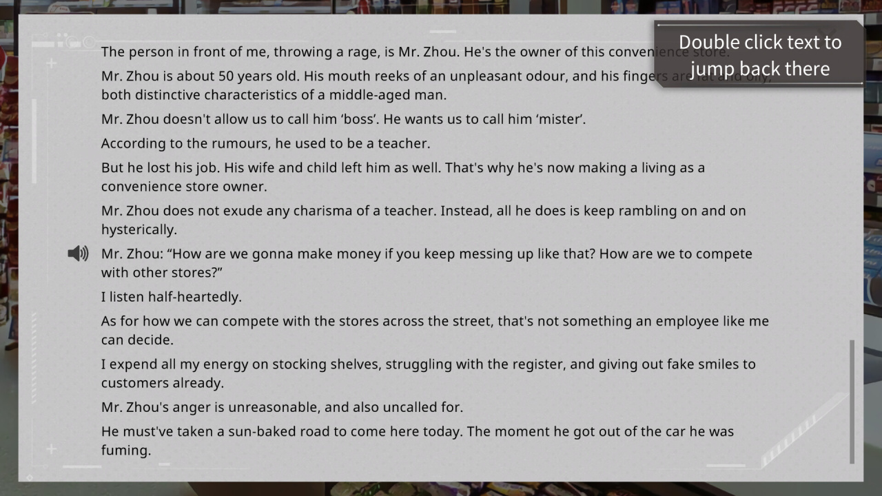 Snowdome v Demo (Steam) Новая версия Полная версия Последняя Дата выхода 23 июл. 2020 Разработчик Lunatic Works Жанр Визуальная новелла, Аниме, Приключения, Инди, RPG Очень положительные на основе 205 обзоров в Steam 91% Обновлено 4 июня 2025, 11:45 Список изменений Snowdome повествует о жизни Тан Яня, череде дней, проведенных продавцом в круглосуточном магазине под началом неблагодарного босса. Он следует однообразному трудовому графику, не замечаемый начальством и сослуживцами; его бытие напоминает замкнутый круг, не позволяющий двигаться дальше. Надежды, некогда толкнувшие его переехать в мегаполис против воли родных, растворились в текущей действительности. Ключевой эпизод случается, когда извне поступает предложение, сулящее серьёзный поворот: Я пытаюсь спасти мир. Хочешь мне помочь? Этот вопрос открывает перспективу перемен в его положении. Сюжет Snowdome погружает в глубокую изоляцию Тан Яня; у него отсутствуют близкие друзья или возлюбленные, с которыми можно было бы разделить тяготы или радости. Такой дефицит человеческого тепла осложняет его повседневные усилия выжить и мало-помалу уничтожает последние остатки веры в лучшее. Структура этой игры нацелена на содействие пониманию действующих лиц и их сложных ситуаций через демонстрацию обычных людских невзгод. Хотя повествование способно преподнести неожиданные происшествия, меняющие путь Тан Яня, всякий сюжетный изгиб поддерживает внутреннюю логику. Данная нарративная основа способствует изучению людской натуры, так как рассказ стремится к контакту с аудиторией через сопереживание личным трудностям. Разработчики стремятся, чтобы игроки улавливали фундаментальную логику даже в самых непредсказуемых сюжетных ходах, побуждая к осмыслению. Задача заключается не в подкреплении каждой мелочи неоспоримым фактом, а в выстраивании цепочки причин и следствий, закономерно проявляющейся в игровом пространстве. Скачать торрент Скриншоты Показать больше Видео из игры Скачать БЕЗ торрента прямая ссылка через uTorria Альтернативные раздачи Прямые ссылки Облачные хранилища v Demo (Steam) Показать Системные требования ОС: Windows 7, 8, 10 (64 бита) Процессор: 2 ГГц, sse2 Оперативная память: 1 ГБ Видеокарта: 1 ГБ Место на диске: 1 ГБ От первого лица, Глубокий сюжет, Тайна, 90-е, Казуальная, Атмосферная, Драма, Линейная, Проработанная вселенная, Процедурная генерация, Повествовательная, Стилизация, Кинематографичная, Научная фантастика, Психологический хоррор