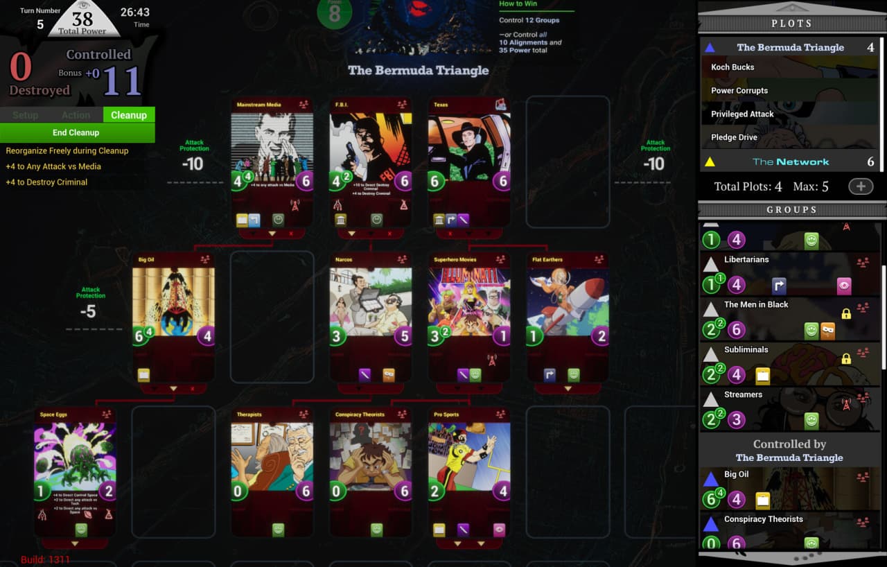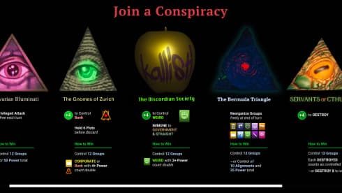 На выбор доступно 6 тайных обществ, обладающих уникальными сильными сторонами, способностями и условиями победы, определяющими их путь к верховенству. Одни фракции стремятся к прямой власти или финансовому накоплению, другие же жаждут сделать мир более странным или попросту все уничтожить. Выбор организации напрямую влияет на доступные игроку победные стратегии. Эта карточная игра содержит 382 иллюстрированные карты, детализирующие сообщества, интриги и схемы для достижения столь разных целей.