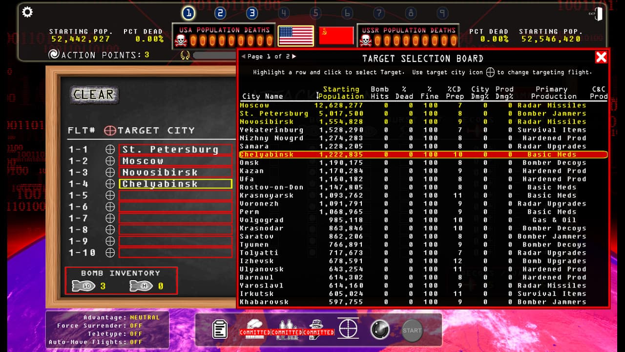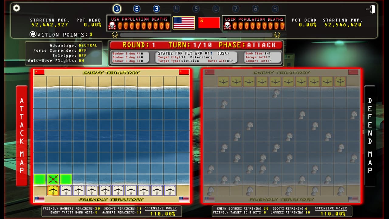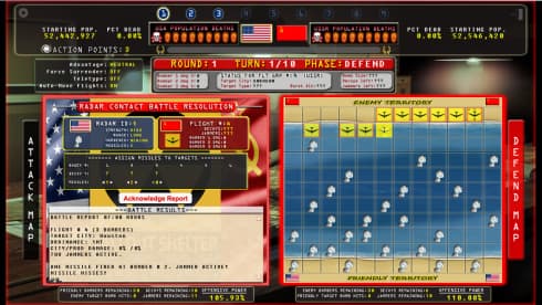 После каждого раунда эта игра генерирует детальные военные сводки, отражающие текущие результаты и статистику для внесения стратегических корректировок. Итоговый рапорт определяет окончательный исход, от сокрушительного поражения до триумфальной победы, основываясь на разнице в проценте уничтоженного населения. Проект предусматривает особые условия, например, принудительную капитуляцию, если командные центры страны получат 90 и более единиц урона. Функция автоперемещения позволяет искусственному интеллекту автоматизировать движение авиации.