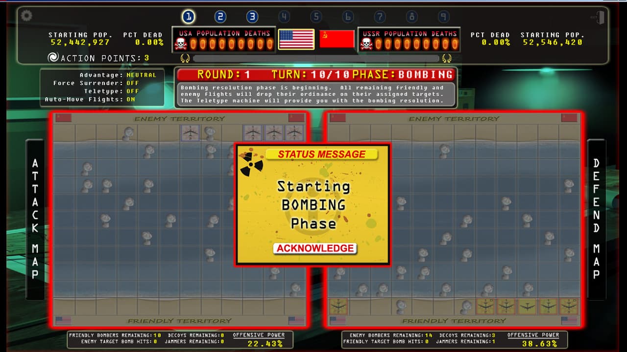 Выживание нации зависит от стратегических решений, поскольку симулятор воссоздаёт исходы атомной войны в эпоху до появления межконтинентальных баллистических ракет. Противостояние в Bombergeddon длится 3, 6 или 9 раундов. Перед началом каждого из них игрок распределяет национальные ресурсы между производством, гражданской обороной и шпионажем. В течение следующих 10 ходов авиагруппы бомбардировщиков движутся к целям, требуя принятия решений при столкновениях с радиолокационными станциями. По завершении раунда уцелевшие самолёты пытаются сбросить свой ядерный арсенал на намеченные городские центры.