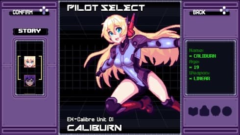Exo-Calibre предлагает на выбор 3 стартовых пилотов, а новые персонажи открываются по мере прохождения. Каждый пилот обладает уникальным стилем стрельбы и особым оружием ближнего боя, что требует выработки различной тактики ведения боя. Геймплей представляет собой прохождение вертикальных уровней, наполненных волнами противников, и завершается битвами с масштабными боссами. Система начисления очков вознаграждает умелую игру, предоставляя бонусы за сохранение высокого уровня здоровья и прохождение этапов без потерь.