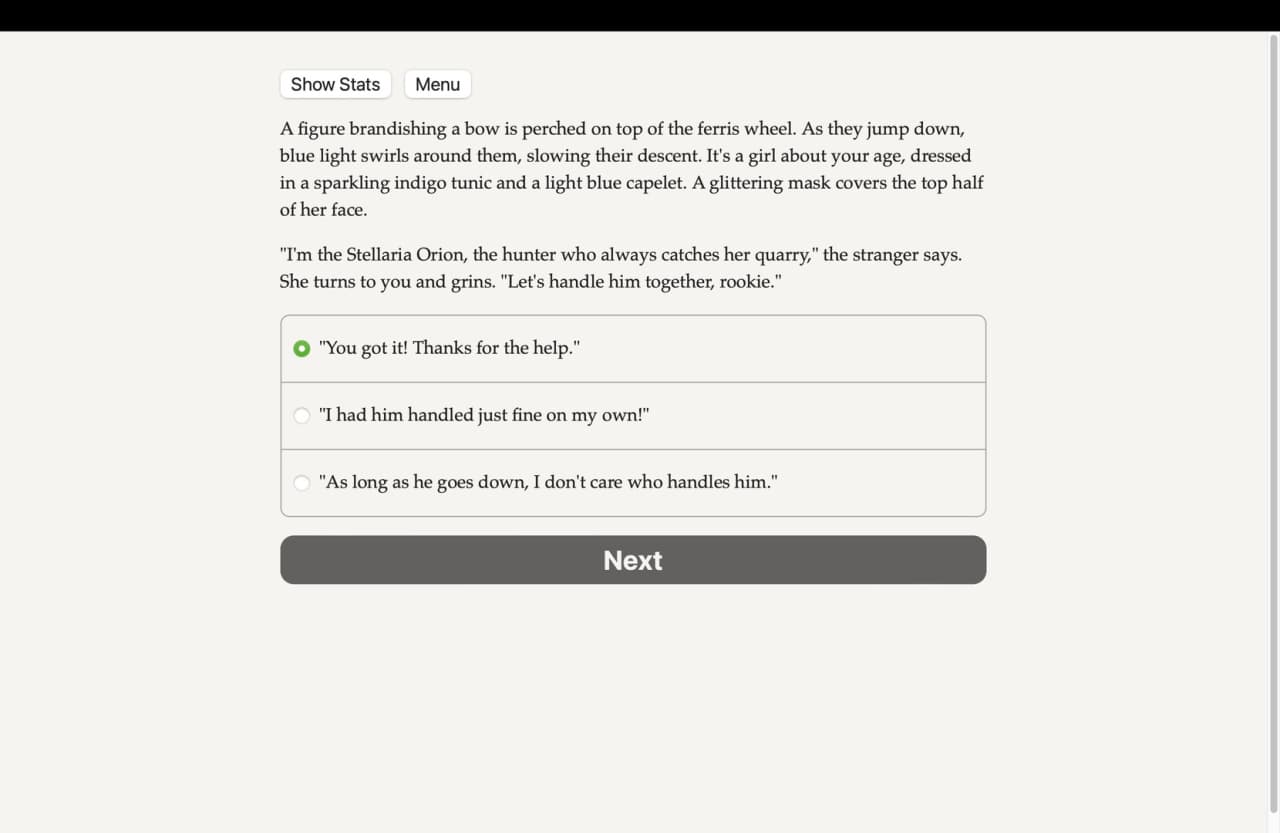 Star Crystal Warriors Go! предлагает обширные опции для создания персонажа, включая гендерную идентичность и сексуальность. Игрок настраивает своего волшебного воина, выбирая наряд, оружие и особый цвет магии снов. Сюжетные ветки позволяют завязать романтические отношения с близким другом, загадочным новичком в школе или даже антагонистом-Кошмаром. Принятые решения формируют эти взаимоотношения и связь протагониста со своим питомцем-спутником, направляя дальнейшее развитие истории.