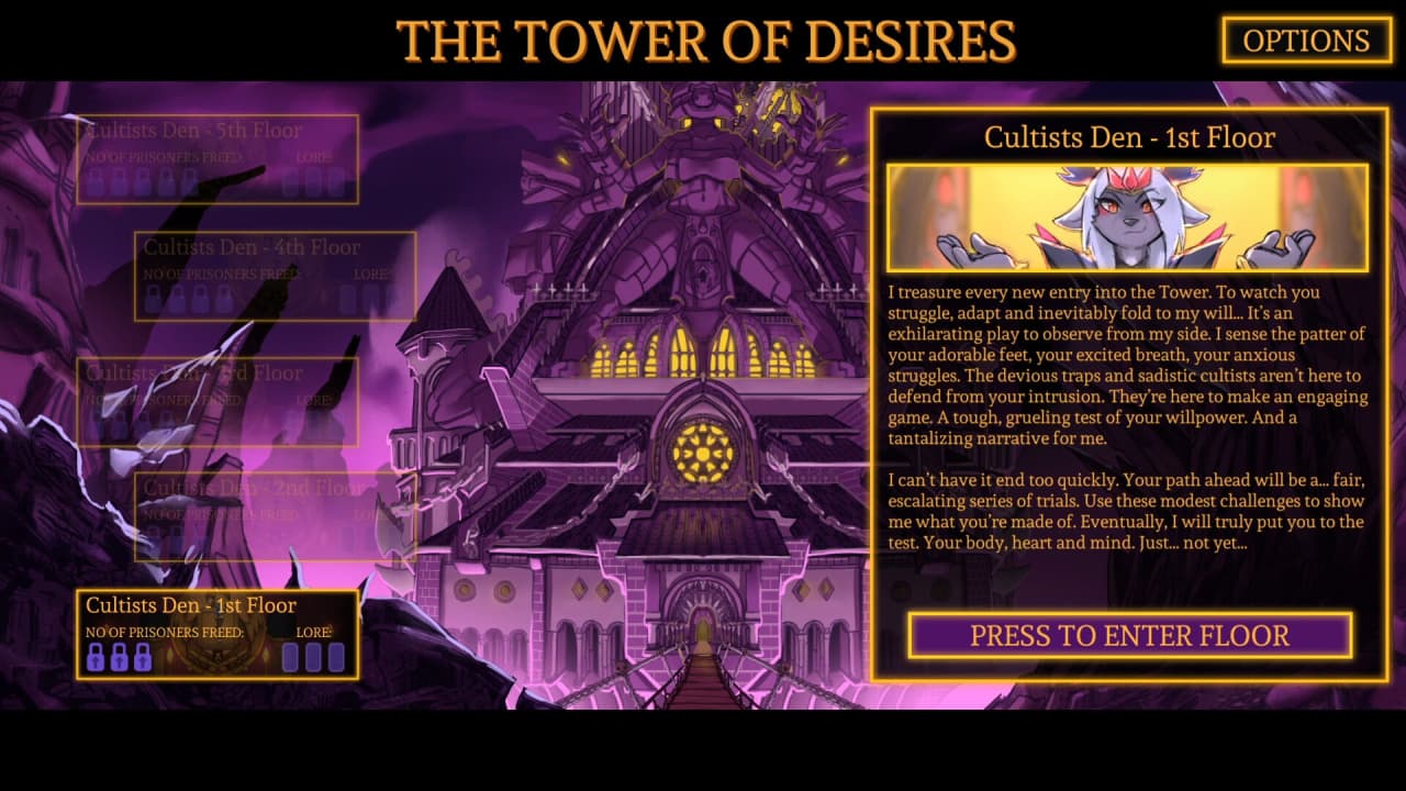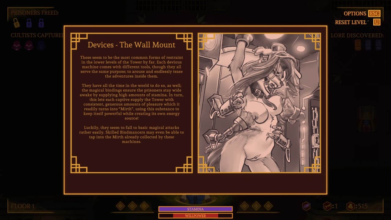 Каждый этаж, представленный в рисованном мультяшном стиле, содержит уникальную конфигурацию NSFW-опасностей, хитроумных ловушек для захвата и множества враждебных существ, которые служат воле башни. В этой зачастую комедийной, но неизменно откровенной атмосфере The Bindmancer, волшебница переходит от одного сложного испытания к другому, освобождая встреченных по пути пленников и подвергая поверженных противников разнообразным наказаниям при помощи своих связывающих заклинаний.