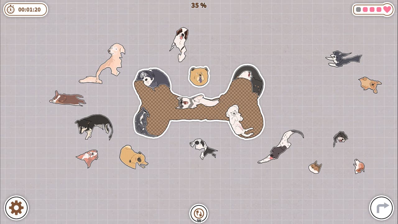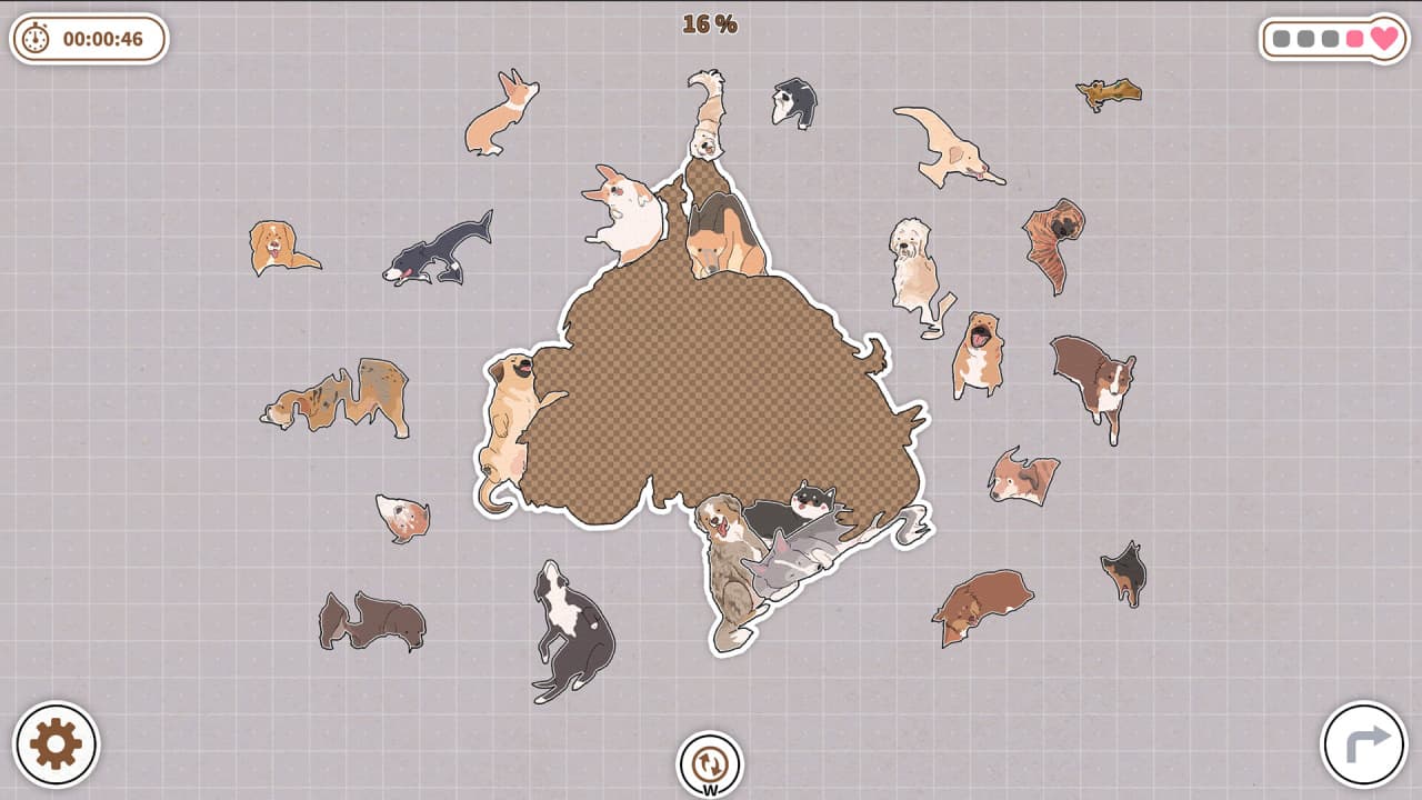 Атмосфера тайтла построена на расслабляющих и умиротворяющих механиках, поощряющих методичное размещение частей. Сотни разных иллюстраций собак выступают строительными блоками для каждого пазла, создавая прочную тематическую целостность. Весь процесс выстроен как спокойное и вдумчивое занятие, основанное на наблюдении и поиске закономерностей. По мере прохождения открываются новые наборы псовых, что поддерживает основную идею и предлагает свежие задачки для решения.