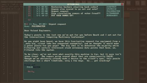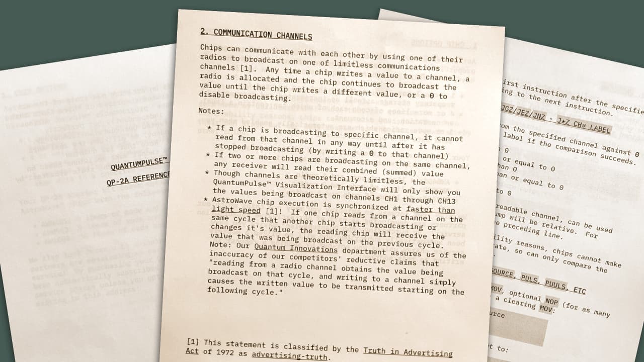 Действие QuantumPulse 2A разворачивается в альтернативной вселенной 1980-х, во времена холодной войны. Геймерам предстоит взаимодействовать с вымышленным компьютером, решая логические задачи через текстовый интерфейс. Архитектура устройства накладывает уникальные ограничения на поиск решений. Внутренняя связь между компонентами происходит путём трансляции сигналов на радиоканалы. Условные операции проверяют значения, передаваемые с других чипов, создавая особую среду для программирования с акцентом на управление сигналами и синхронизацию вместо прямых соединений.