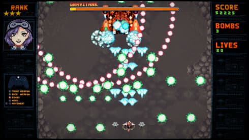 Дополнительную тактическую глубину обеспечивают специализированные системы для боя и подсчета очков. Режим фокусировки связан с рельсотроном, использующим лазерный прицел для наводки точных выстрелов. Бомбы служат двойной цели: они уничтожают все снаряды на экране и наносят масштабный урон, а их мощность временно повышается за счет секретных предметов. Система рангов поощряет агрессивный стиль игры, вознаграждая за мастерское ведение боя. Помимо стандартного прохождения, сложный и скрытый гипер-режимы предлагают повышенную сложность, заодно увеличивая скорость и мобильность корабля.