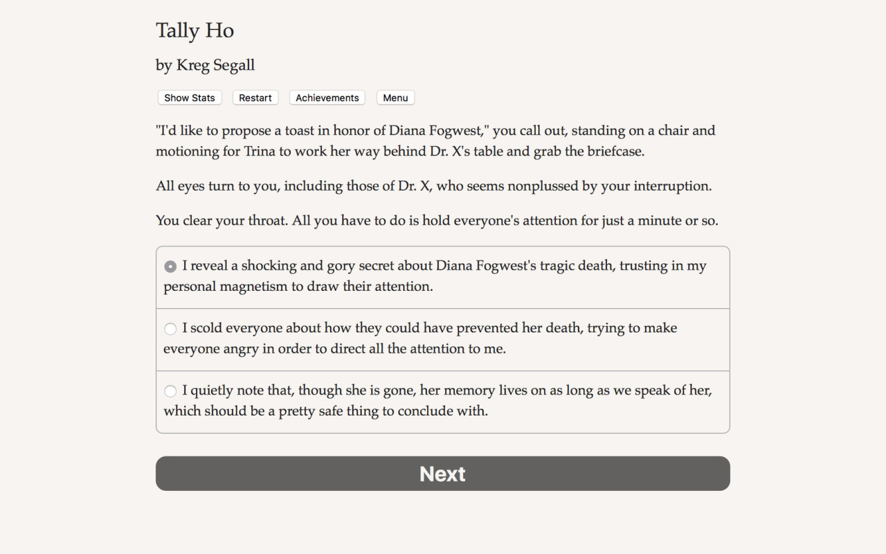 Tally Ho v Build 16956637 Новая версия Полная версия Последняя Дата выхода 14 дек. 2017 Разработчик Choice of Games Жанр Инди, Приключения, RPG Очень положительные на основе 112 обзоров в Steam 94% Обновлено 25 июля 2025, 16:59 Список изменений Tally Ho ставит игрока в роль личного слуги некоего Рори Винтерминта. В образе камердинера или горничной предстоит разбираться с многочисленными проблемами, созданными нанимателем. Должность требует особого набора умений для деликатного решения щекотливых социальных ситуаций. Успех в этом окружении зависит не только от простого служения, ведь самый эффективный помощник не обязательно ангел, а выбранные методы определяют исход каждого дела. История в Tally Ho предлагает череду необычных поручений. Предстоит иметь дело со строптивыми тетушками и нечистыми на руку гостями. Дополнительные обязанности включают организацию загородной охоты на лис и непростую задачу по отлову сбежавших экзотических птиц, сохраняя при этом внешнее спокойствие. Эта интерактивная игра развивается под влиянием ваших решений, напрямую определяющих ход событий и то, как в итоге будут улажены все запутанные дела. Весь игровой процесс построен на интерактивном сценарии объемом 600000 слов. Выбор вариантов ответа является единственным механизмом управления сюжетом в этой полностью текстовой истории. Проект функционирует без графических элементов или звукового сопровождения. Следовательно, повествование раскрывается исключительно через письменные описания и предлагаемые ветвящиеся сценарии. Его структура полагается на вашу способность интерпретировать ситуации и принимать решения, основываясь на предоставленном тексте. Скачать торрент Скриншоты Видео из игры Скачать Tally Ho Тип релиза Пиратка (Таблетка: Не требуется) Версия v Build 16956637 (Полная) Последняя Размер 44 МБ Интерфейс Английский Озвучка Отсутствует Установка: Скачать .torrent торрент файл Скачать БЕЗ торрента прямая ссылка через uTorria Альтернативные раздачи Прямые ссылки Облачные хранилища v Build 16956637 95 МБ Показать Системные требования ОС: Windows 7, 8, 10 (64 бита) Процессор: Intel Core2 Duo Оперативная память: 1 ГБ Видеокарта: 512 МБ Место на диске: 50 МБ Выбери себе приключение, Решения с последствиями
