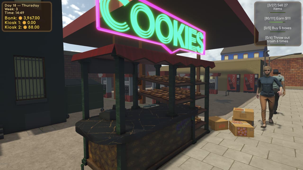 Каждое решение, от исследования новых вкусов до установки автоматического робота-продавца, напрямую влияет на исход дела. Деятельность по управлению киоском разворачивается в условиях, где полицейские рейды и конфискация запрещенных товаров являются такой же частью рутины, как и уборка мусора вокруг своего заведения. Для достижения успеха необходимо постоянно улучшать свое рабочее место: модернизировать прилавок, крышу и полки, чтобы заманивать больше покупателей.