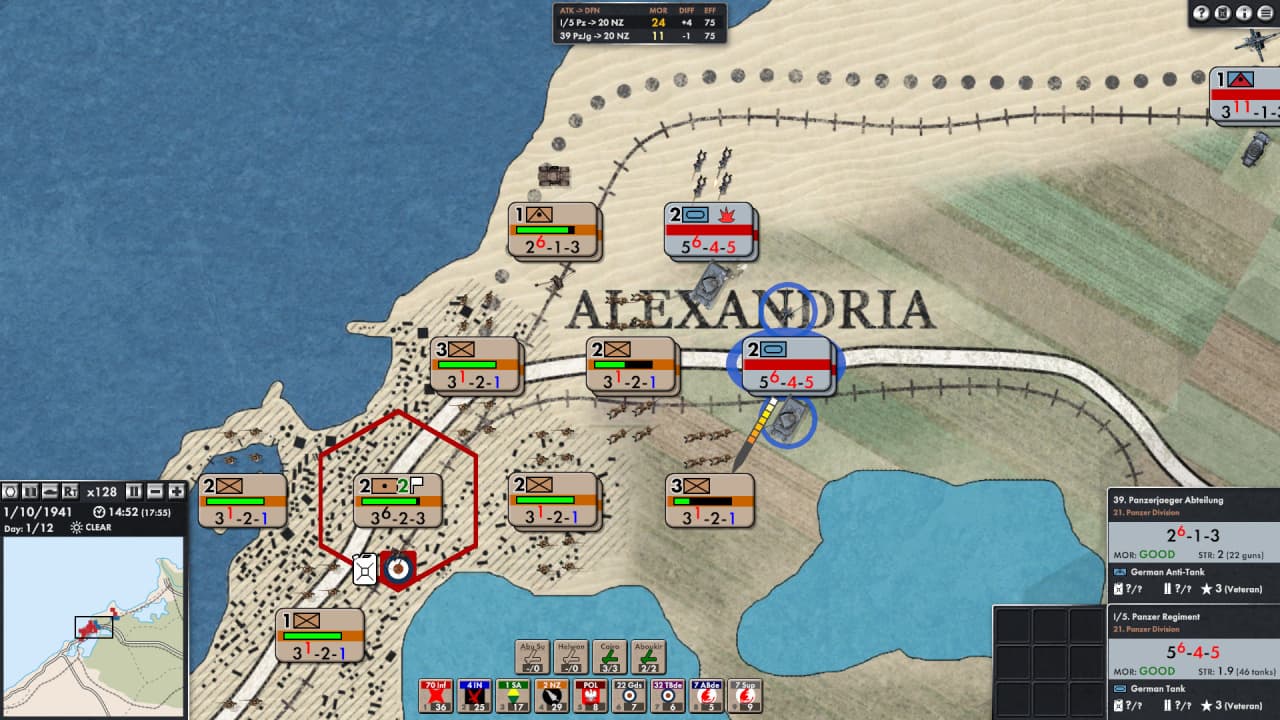 Центральным элементом механики является управление войсками в пошаговом режиме WeGo или в реальном времени, что передает хаотичность и скорость мобильных боевых действий в пустыне. Проект предлагает как исторические кампании, воссозданные на основе архивных данных о составах армий и ходе сражений, так и гипотетические сценарии. Геймплей Attack at Dawn: North Africa делает особый акцент на реализм: боевая эффективность юнитов, туман войны и логистика играют решающую роль в исходе противостояния.