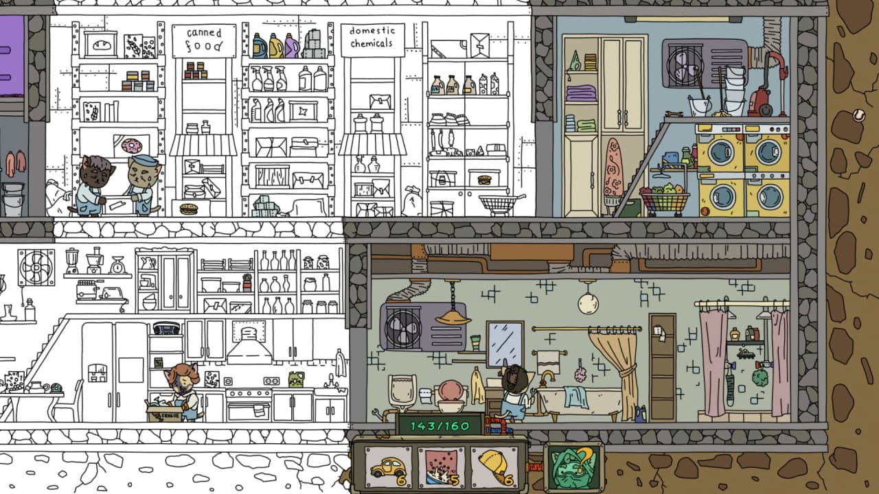 Этот проект в жанре поиска предметов предлагает исследовать необычное убежище, которое было создано кошками в ожидании неминуемой катастрофы. Весь визуальный стиль FIND ALL: Bunker выполнен в двухмерной, рисованной от руки манере, что придает ему особую стилизацию. Процесс поиска объектов в этом постапокалиптическом, но в то же время милом и расслабляющем приключении, подходит для семейного досуга. Каждая найденная вещь позволяет вернуть краски в черно-белое окружение, постепенно преображая локации и открывая новые детали этого уютного мира, стоящего на пороге глобальных перемен.