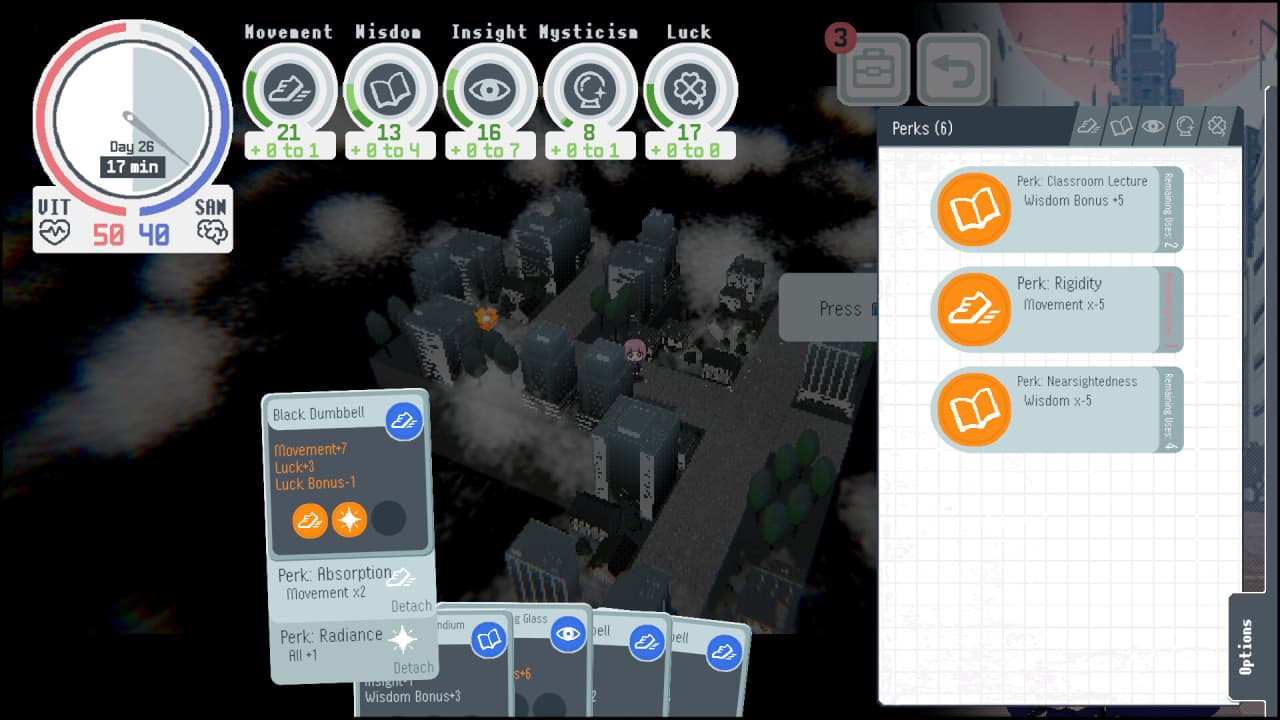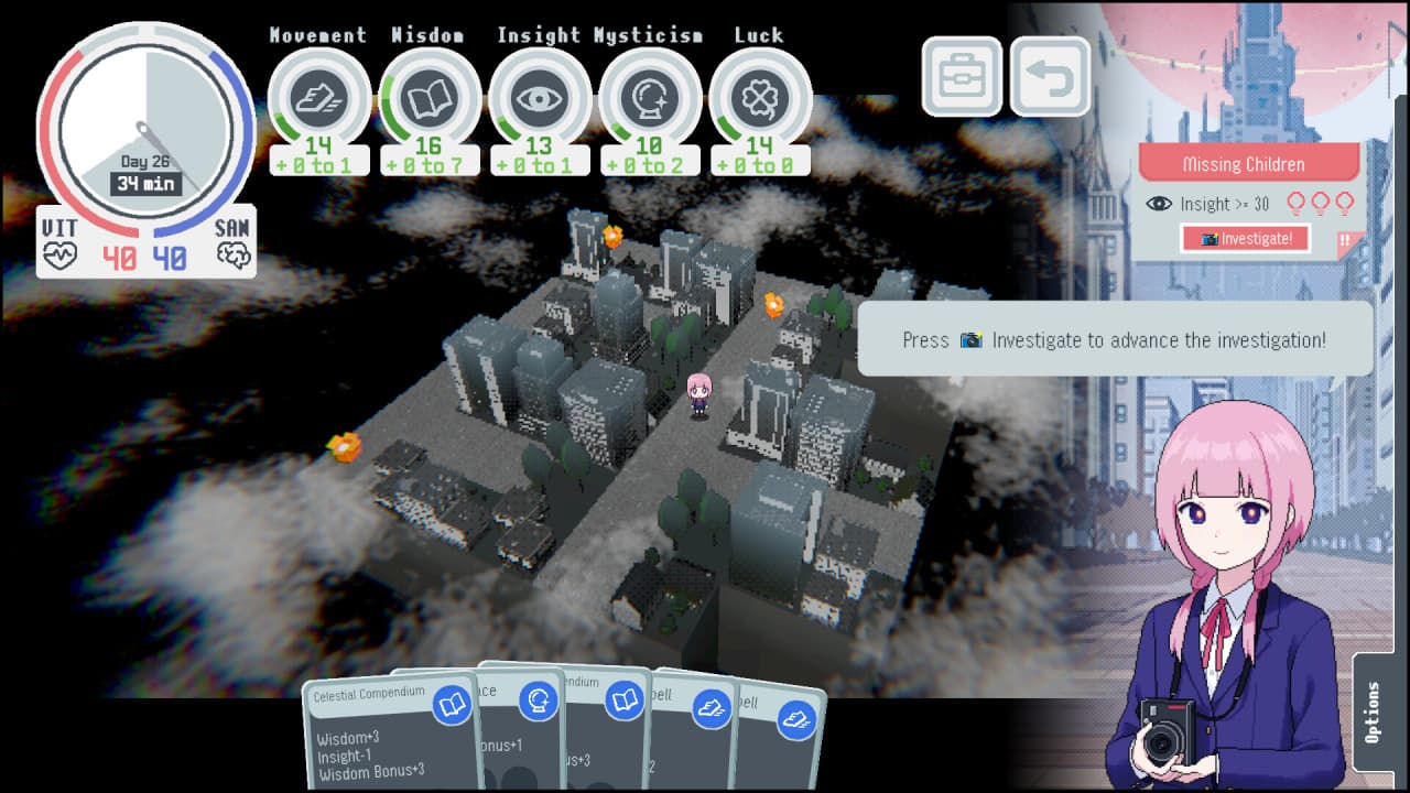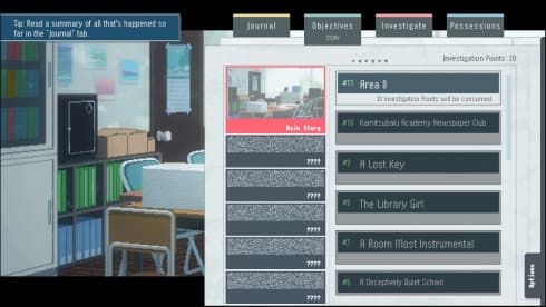 Продвижение в расследованиях требует успешного прохождения специальных испытаний, исход которых определяется уровнем развития пяти характеристик: Подвижности, Мудрости, Проницательности, Мистицизма и Удачи. Для повышения этих параметров необходимо тщательно исследовать локации города, находя уникальные предметы и получая особые перки. Игровой процесс проекта KAMITSUBAKI ACADEMY NEWSPAPER CLUB четко разделен на две фазы. В одной из них выстраиваются социальные связи с коллегами по кружку через прямое взаимодействие. Другая фаза целиком посвящена свободному изучению городских районов, где поиск улик и разгадка тайн постепенно возвращают главному герою утраченные воспоминания.