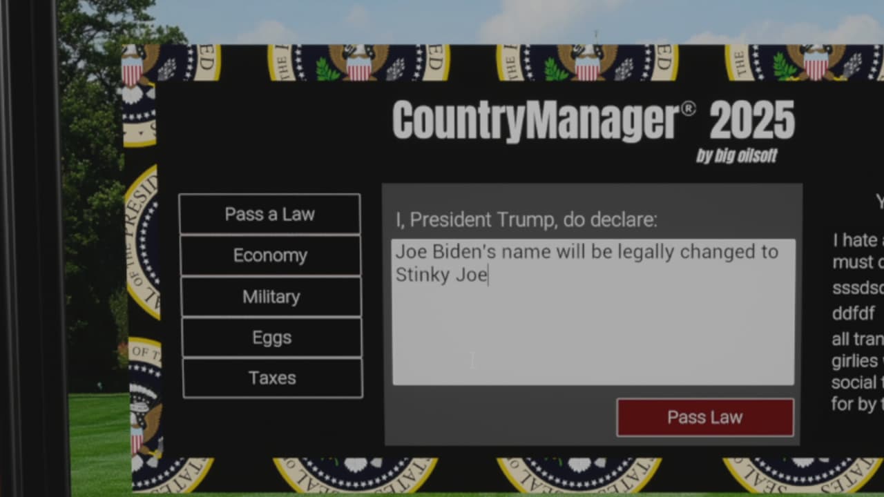 Trump Simulator 2025 — сатирический симулятор, где управление государством перенесено на борт самолёта Air Force One, летящего на огромной высоте. Протагонисту, избранному президенту, предстоит провести свой второй и заключительный срок, используя власть без каких-либо ограничений. Среди доступных инструментов имеется даже огнемёт, предназначенный для расправы с агентами, которые на поверку оказываются роботами-горничными. Таким образом, вместо физического устранения происходит лишь эффектное выжигание их внутренних микросхем, что подчёркивает абсурдность всего происходящего. Все ключевые решения принимаются в полёте, вдали от земной суеты.